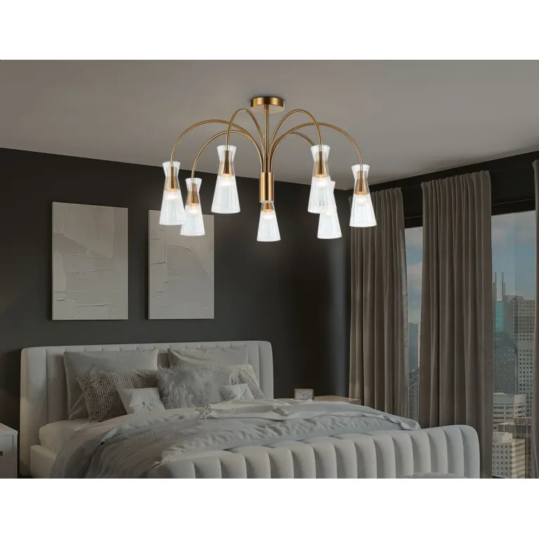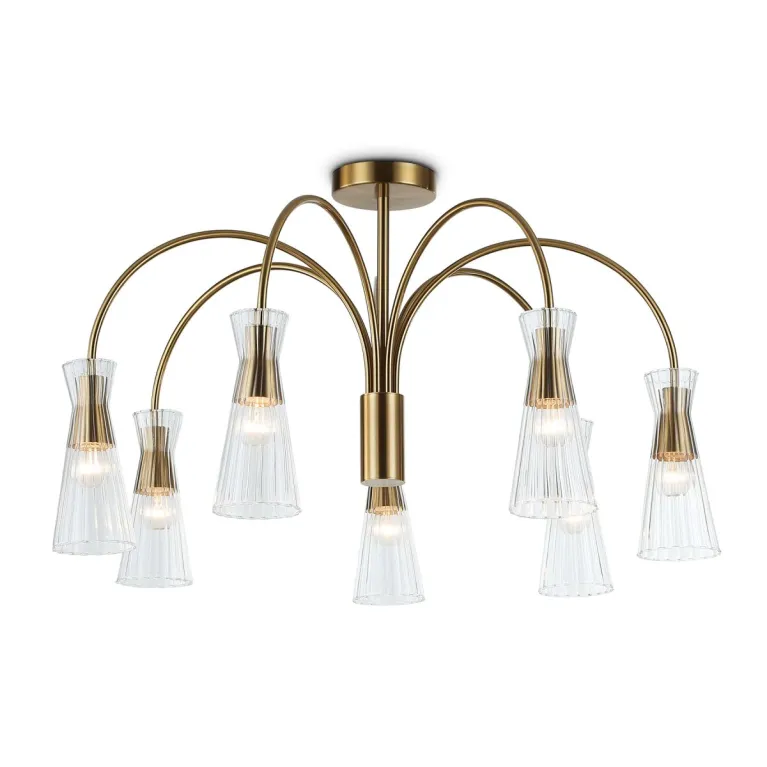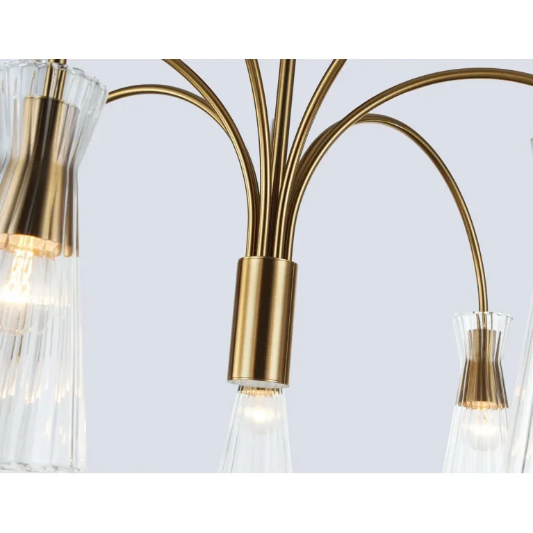 Преобладающий цвет плафонов: Прозрачный, арматуры: Латунь; материал изготовления арматуры: Металл, размеры, мм: / высота 460 / диаметр 745. Общая мощность – 280 Ватт, а максимальная площадь освещения до 23 м2. Основной тип ламп, предусмотренный производителем: Накаливания с цоколем E14. В зависимости от предпочтений можно использовать лампы теплового, холодного или нейтрального света, за исключением люстр с типом цоколя LED.