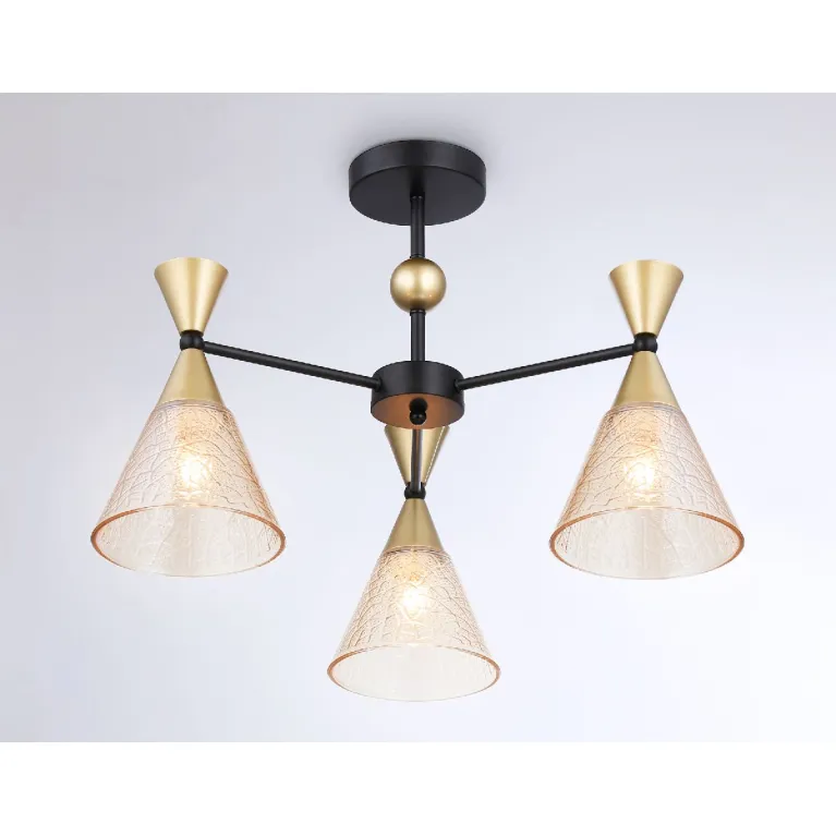 Преобладающий цвет плафонов: Янтарный, арматуры: Черный; материал изготовления арматуры: Металл, размеры, мм: / высота 380 / диаметр 580. Общая мощность – 180 Ватт, а максимальная площадь освещения до 9 м2. Основной тип ламп, предусмотренный производителем: Накаливания с цоколем E27. В зависимости от предпочтений можно использовать лампы теплового, холодного или нейтрального света, за исключением люстр с типом цоколя LED.