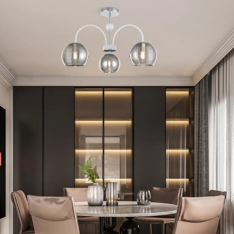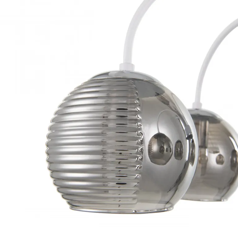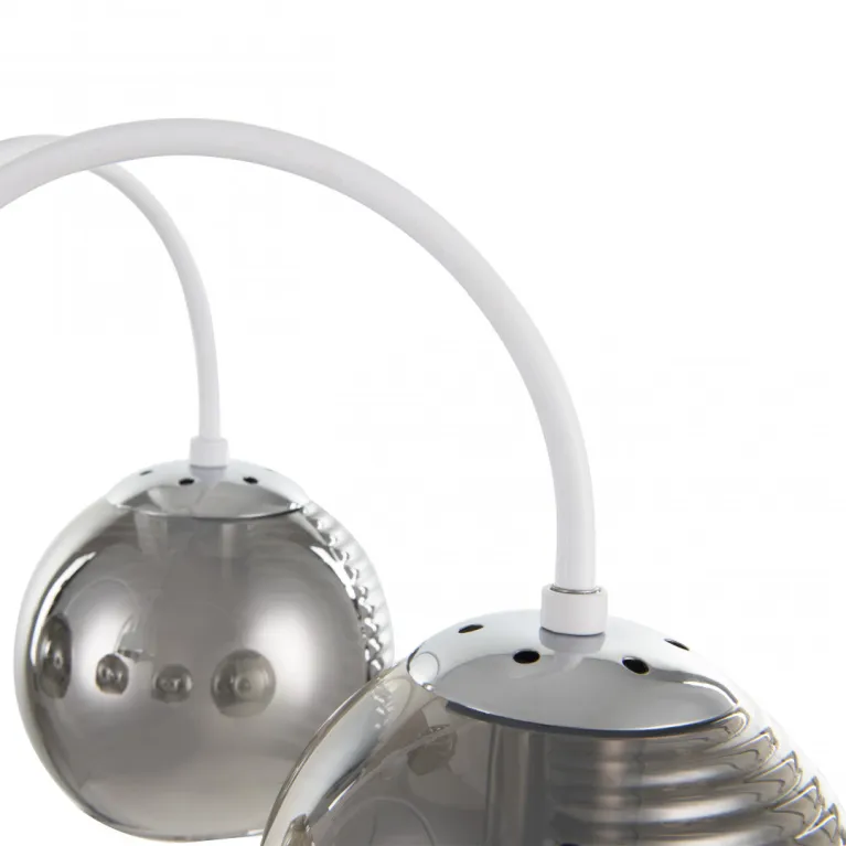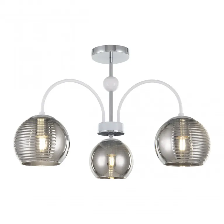 Преобладающий цвет плафонов: Дымчатый, арматуры: Хром; материал изготовления арматуры: Металл, размеры, мм: / высота 360 / диаметр 600. Общая мощность – 120 Ватт, а максимальная площадь освещения до 6 м2. Основной тип ламп, предусмотренный производителем: Накаливания с цоколем E27. В зависимости от предпочтений можно использовать лампы теплового, холодного или нейтрального света, за исключением люстр с типом цоколя LED.