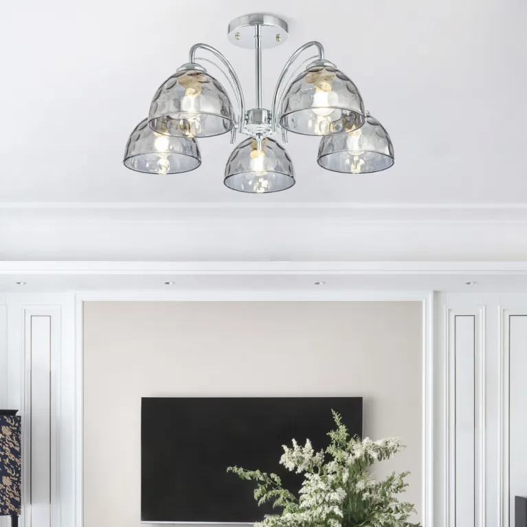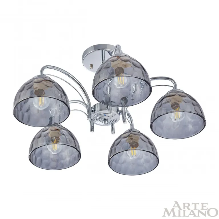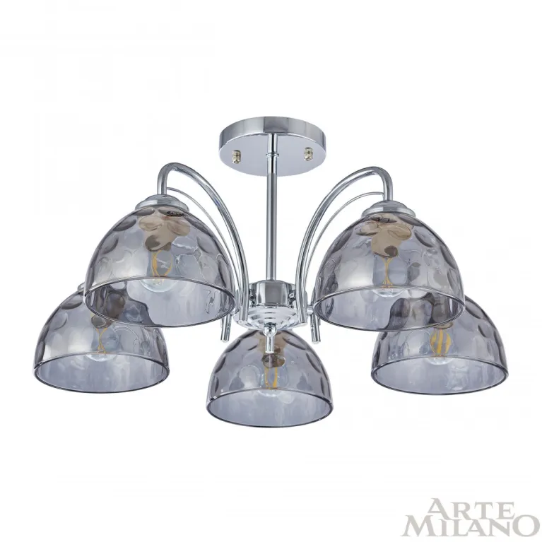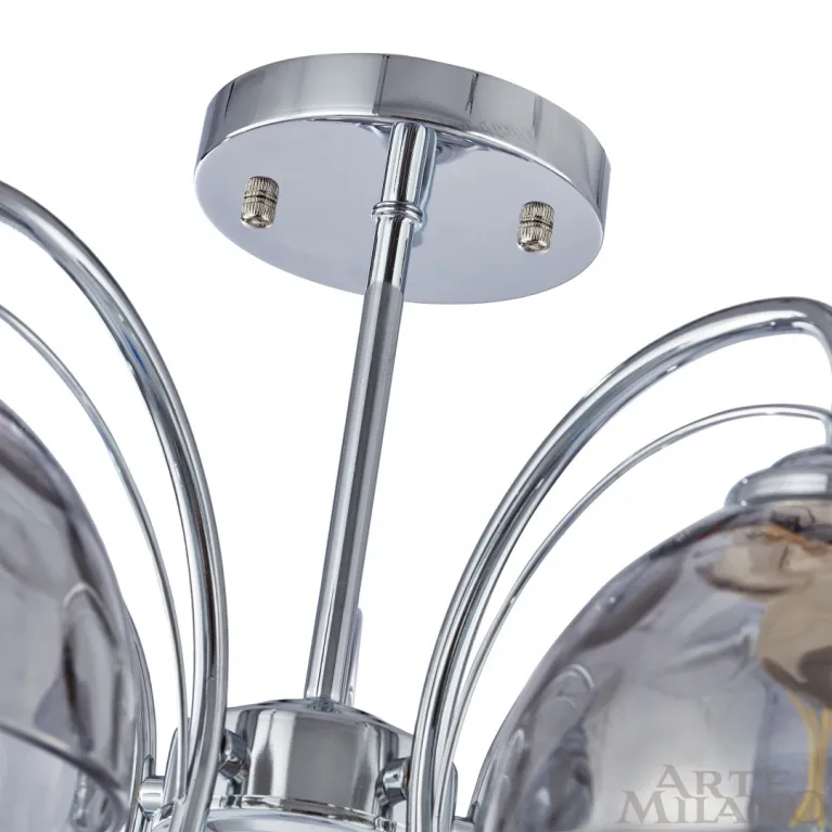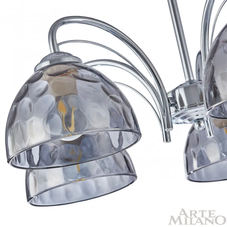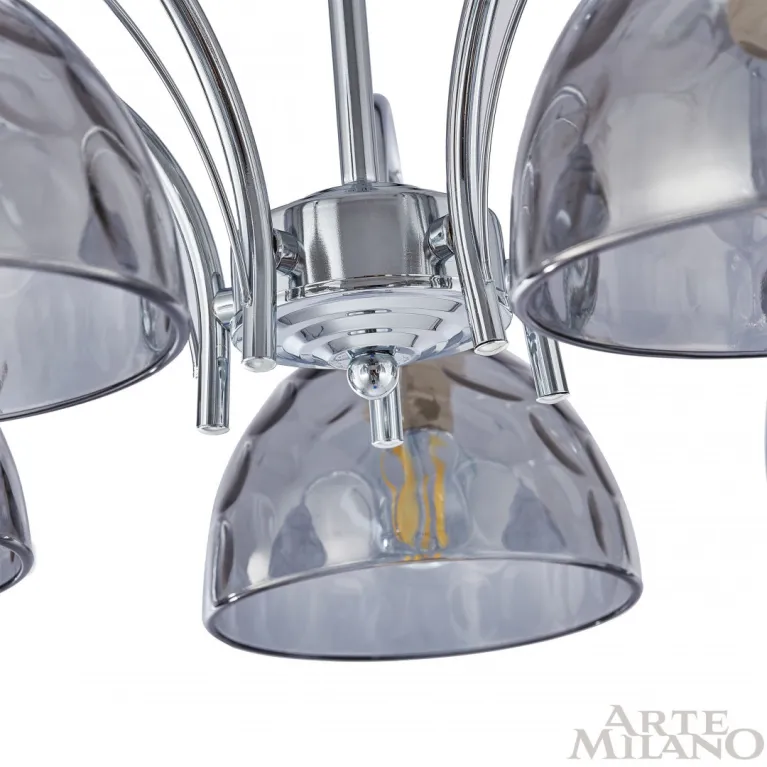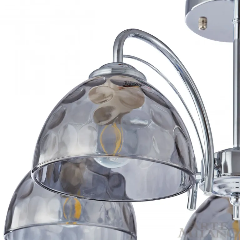 Преобладающий цвет плафонов: Дымчатый, арматуры: Хром; материал изготовления арматуры: Металл, размеры, мм: / высота 260 / диаметр 500. Общая мощность – 200 Ватт, а максимальная площадь освещения до 10 м2. Основной тип ламп, предусмотренный производителем: Накаливания с цоколем E27. В зависимости от предпочтений можно использовать лампы теплового, холодного или нейтрального света, за исключением люстр с типом цоколя LED.
