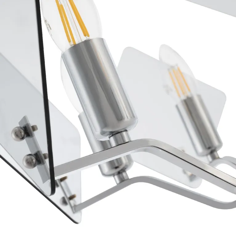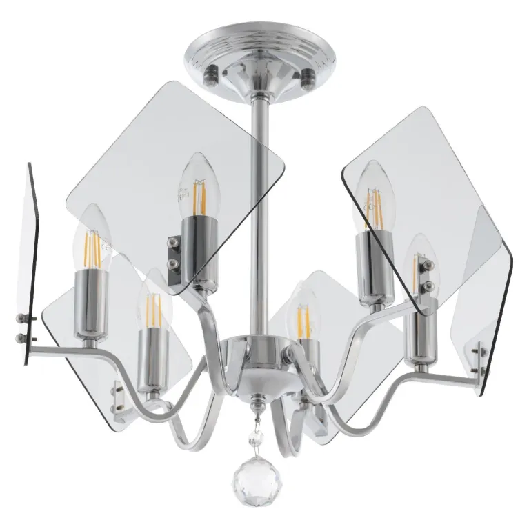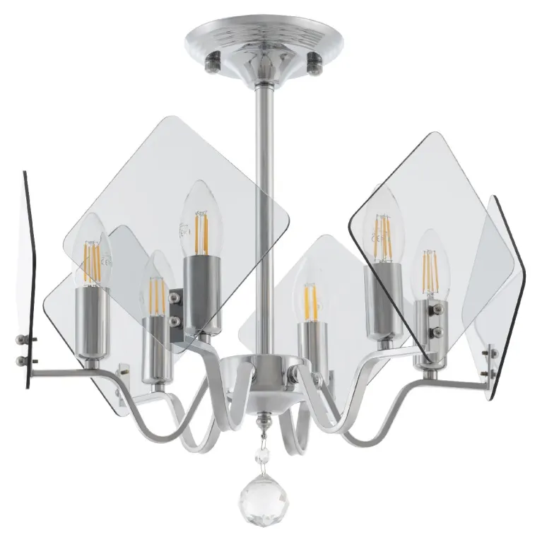 Преобладающий цвет плафонов: Прозрачный, арматуры: Хром; материал изготовления арматуры: Металл, размеры, мм: / высота 420 / диаметр 450. Общая мощность – 240 Ватт. Основной тип ламп, предусмотренный производителем: Накаливания с цоколем E14. В зависимости от предпочтений можно использовать лампы теплового, холодного или нейтрального света, за исключением люстр с типом цоколя LED.