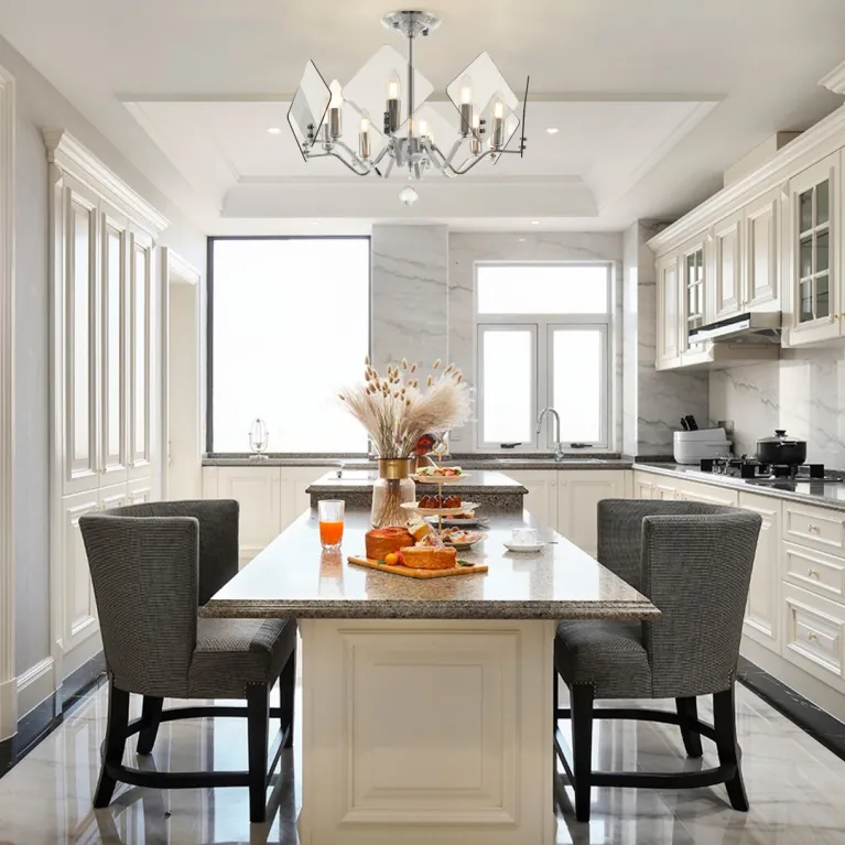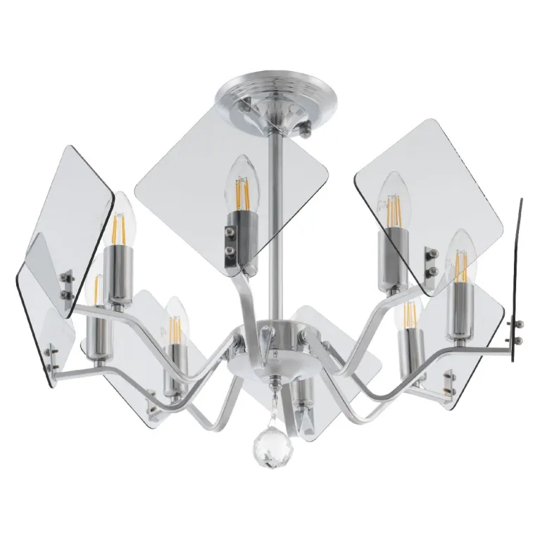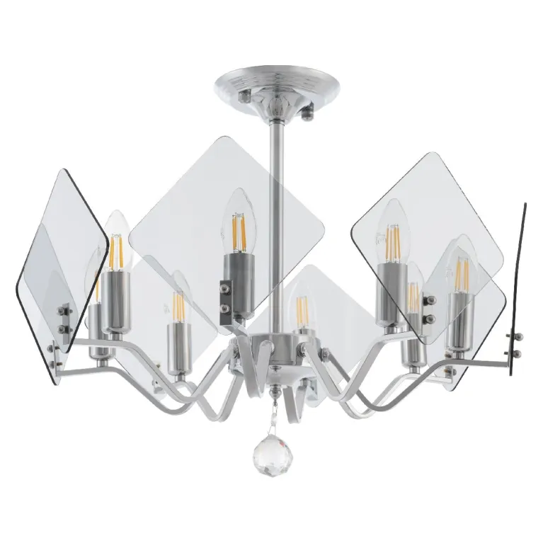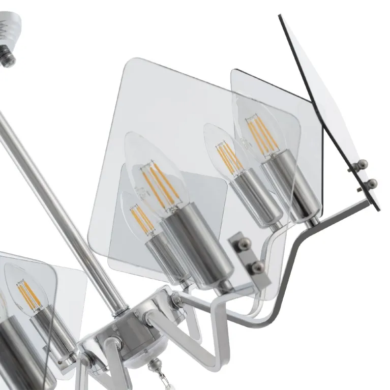 Преобладающий цвет плафонов: Прозрачный, арматуры: Хром; материал изготовления арматуры: Металл, размеры, мм: / высота 430 / диаметр 550. Общая мощность – 320 Ватт. Основной тип ламп, предусмотренный производителем: Накаливания с цоколем E14. В зависимости от предпочтений можно использовать лампы теплового, холодного или нейтрального света, за исключением люстр с типом цоколя LED.