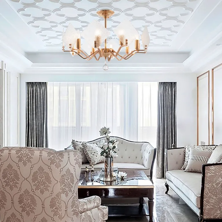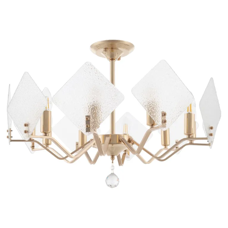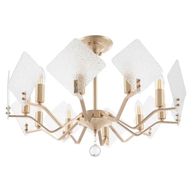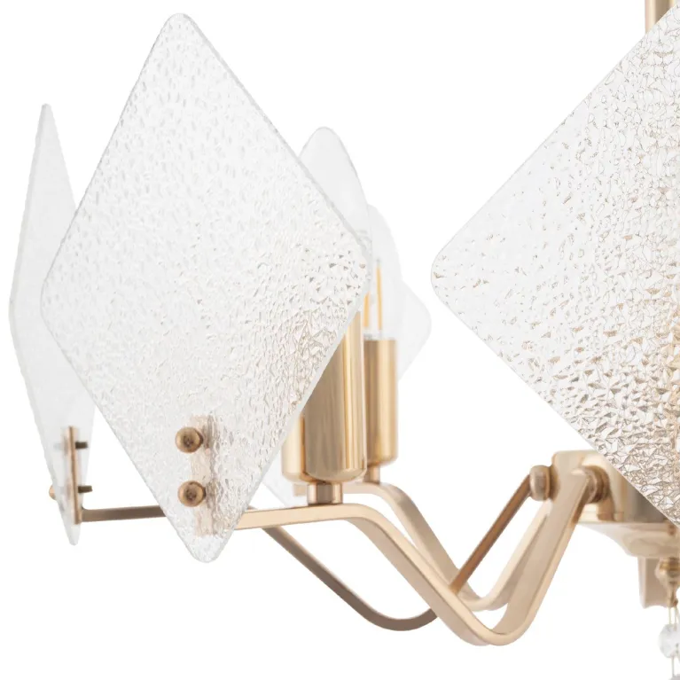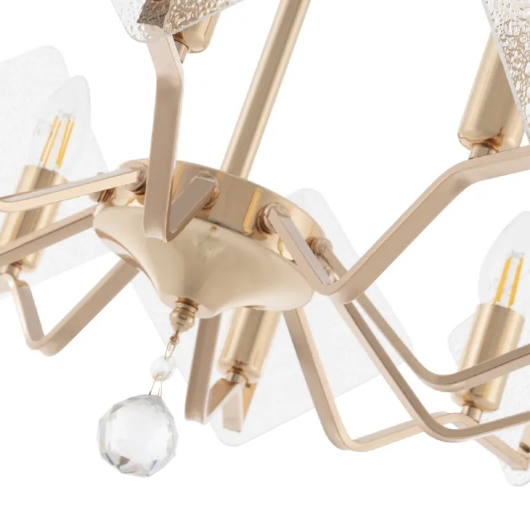Преобладающий цвет плафонов: Прозрачный, арматуры: Золото; материал изготовления арматуры: Металл, размеры, мм: / высота 440 / диаметр 650. Общая мощность – 400 Ватт. Основной тип ламп, предусмотренный производителем: Накаливания с цоколем E14. В зависимости от предпочтений можно использовать лампы теплового, холодного или нейтрального света, за исключением люстр с типом цоколя LED.