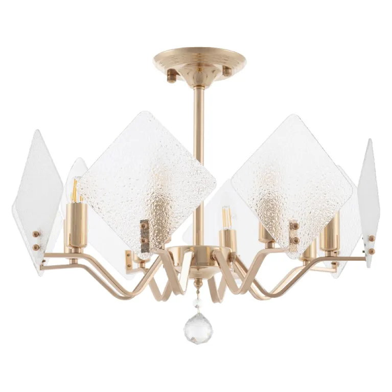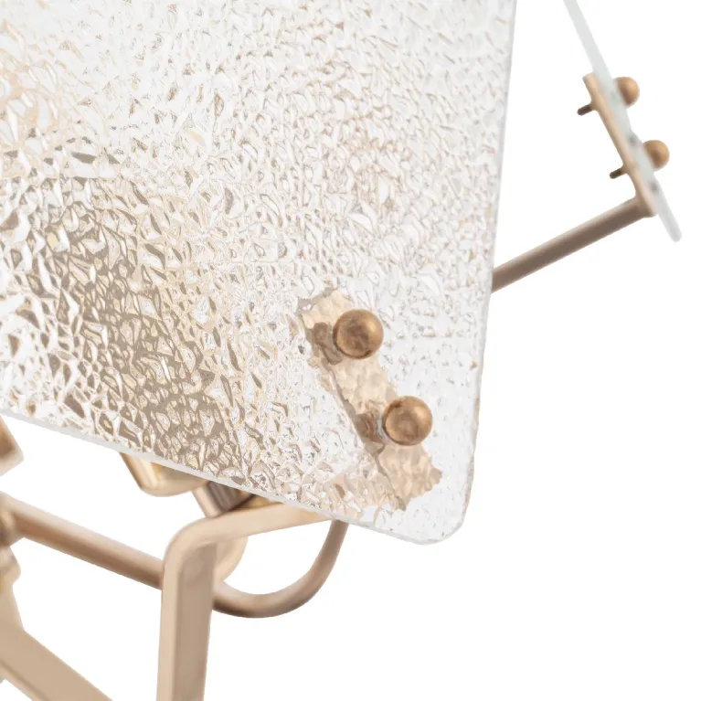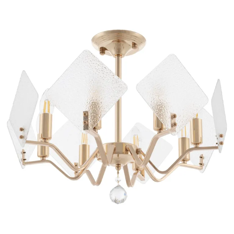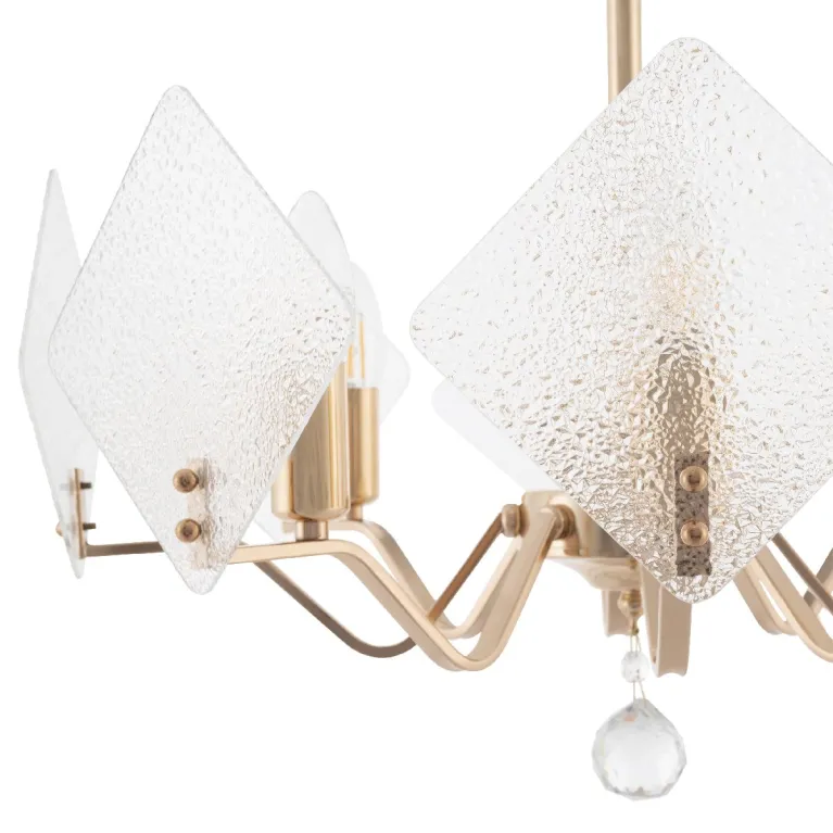 Преобладающий цвет плафонов: Прозрачный, арматуры: Золото; материал изготовления арматуры: Металл, размеры, мм: / высота 430 / диаметр 550. Общая мощность – 320 Ватт. Основной тип ламп, предусмотренный производителем: Накаливания с цоколем E14. В зависимости от предпочтений можно использовать лампы теплового, холодного или нейтрального света, за исключением люстр с типом цоколя LED.