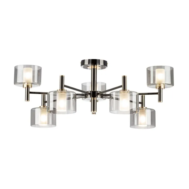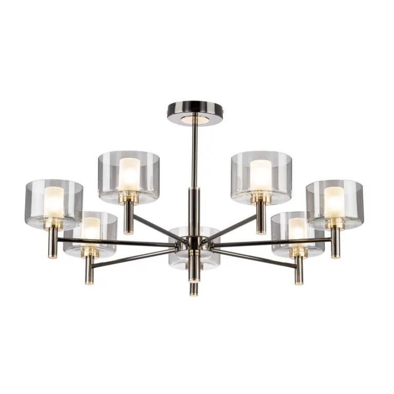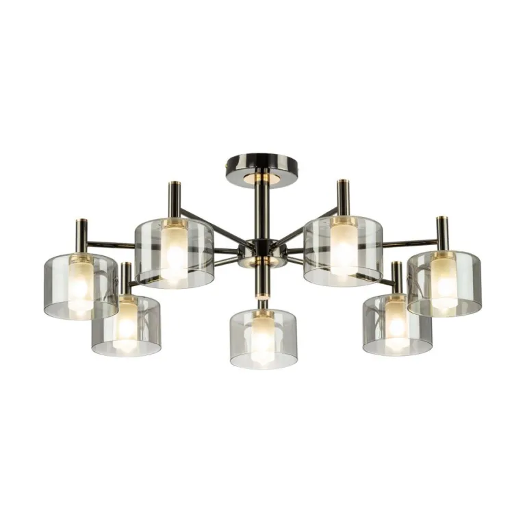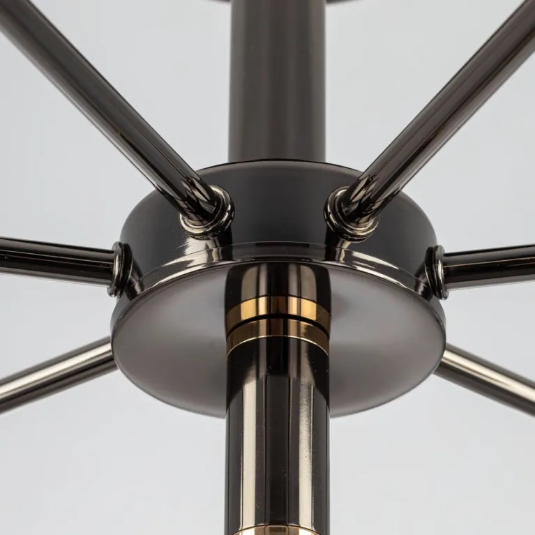 Преобладающий цвет плафонов: Дымчатый, арматуры: Черный; материал изготовления арматуры: Металл, размеры, мм: / высота 530 / диаметр 720. Общая мощность – 70 Ватт, а максимальная площадь освещения до 17 м2. Основной тип ламп, предусмотренный производителем: Светодиодная с цоколем G9. В зависимости от предпочтений можно использовать лампы теплового, холодного или нейтрального света, за исключением люстр с типом цоколя LED.