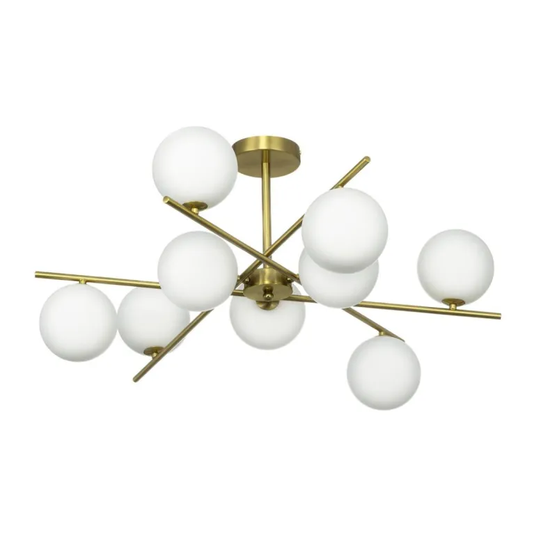 Преобладающий цвет плафонов: Белый, арматуры: Золото; материал изготовления арматуры: Металл, размеры, мм: / высота 325 / диаметр 780. Общая мощность – 90 Ватт, а максимальная площадь освещения до 21 м2. Основной тип ламп, предусмотренный производителем: Светодиодная с цоколем G9. В зависимости от предпочтений можно использовать лампы теплового, холодного или нейтрального света, за исключением люстр с типом цоколя LED.