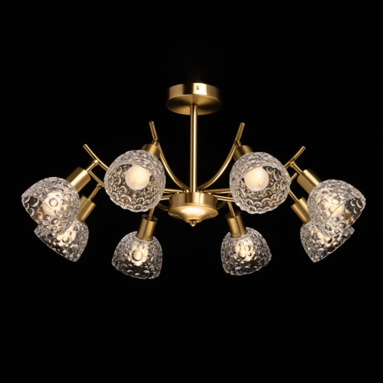 Преобладающий цвет плафонов: Прозрачный, арматуры: Бронза; материал изготовления арматуры: Металл, размеры, мм: / высота 340 / диаметр 720. Общая мощность – 320 Ватт, а максимальная площадь освещения до 24 м2. Основной тип ламп, предусмотренный производителем: Накаливания с цоколем E14. В зависимости от предпочтений можно использовать лампы теплового, холодного или нейтрального света, за исключением люстр с типом цоколя LED.