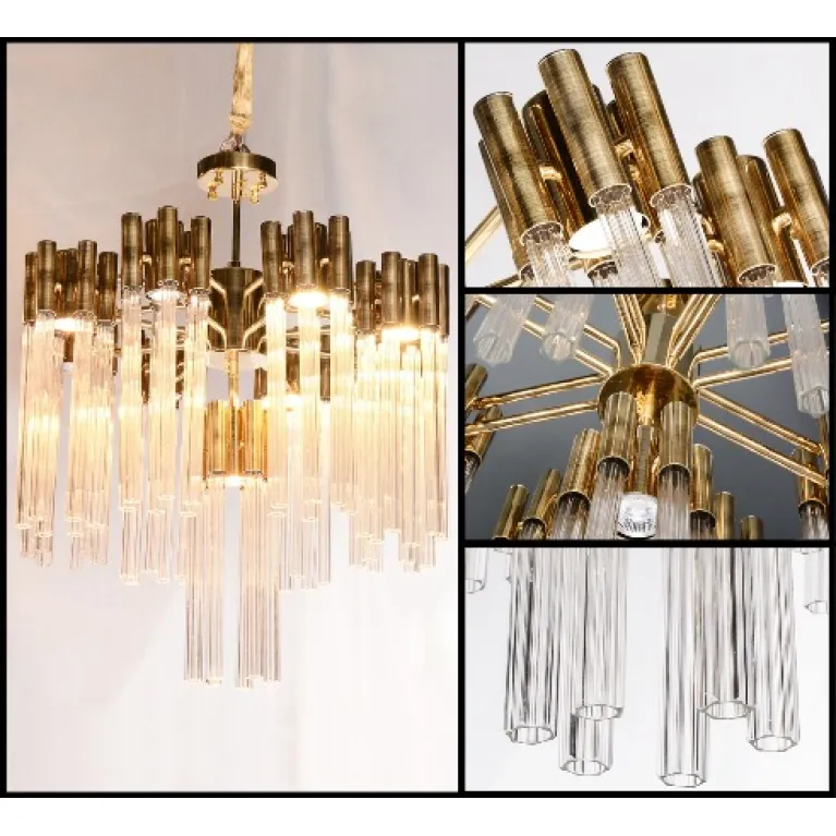 Преобладающий цвет плафонов: Прозрачный, арматуры: Золото; материал изготовления арматуры: Металл, размеры, мм: / высота 755 / диаметр 650. Общая мощность – 360 Ватт. Основной тип ламп, предусмотренный производителем: Галогеновая с цоколем GU10. В зависимости от предпочтений можно использовать лампы теплового, холодного или нейтрального света, за исключением люстр с типом цоколя LED.