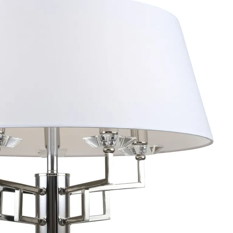 Преобладающий цвет плафонов: Белый, арматуры: Хром; материал изготовления арматуры: Металл, размеры, мм: длина 550 / ширина 550 / высота 570 / диаметр 550. Общая мощность – 200 Ватт, а максимальная площадь освещения до 10 м2. Основной тип ламп, предусмотренный производителем: Накаливания с цоколем E14. В зависимости от предпочтений можно использовать лампы теплового, холодного или нейтрального света, за исключением люстр с типом цоколя LED.