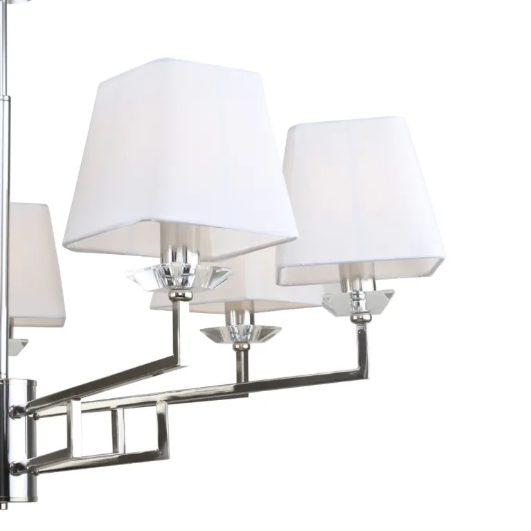 Преобладающий цвет плафонов: Белый, арматуры: Хром; материал изготовления арматуры: Металл, размеры, мм: / высота 500 / диаметр 800. Общая мощность – 280 Ватт, а максимальная площадь освещения до 14 м2. Основной тип ламп, предусмотренный производителем: Накаливания с цоколем E14. В зависимости от предпочтений можно использовать лампы теплового, холодного или нейтрального света, за исключением люстр с типом цоколя LED.