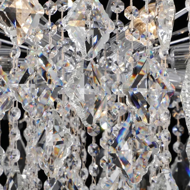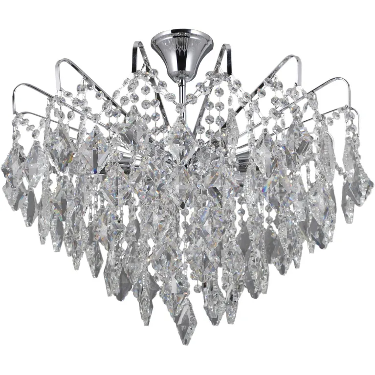 Преобладающий цвет плафонов: Прозрачный, арматуры: Хром; материал изготовления арматуры: Металл, размеры, мм: / высота 540 / диаметр 600. Общая мощность – 280 Ватт, а максимальная площадь освещения до 14 м2. Основной тип ламп, предусмотренный производителем: Накаливания с цоколем E14. В зависимости от предпочтений можно использовать лампы теплового, холодного или нейтрального света, за исключением люстр с типом цоколя LED.