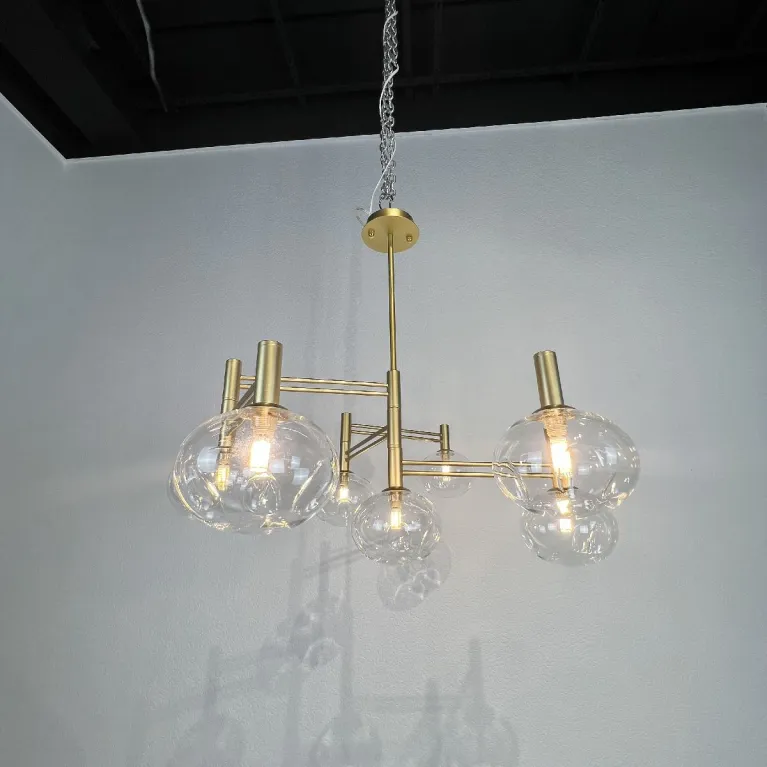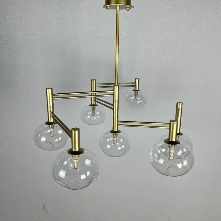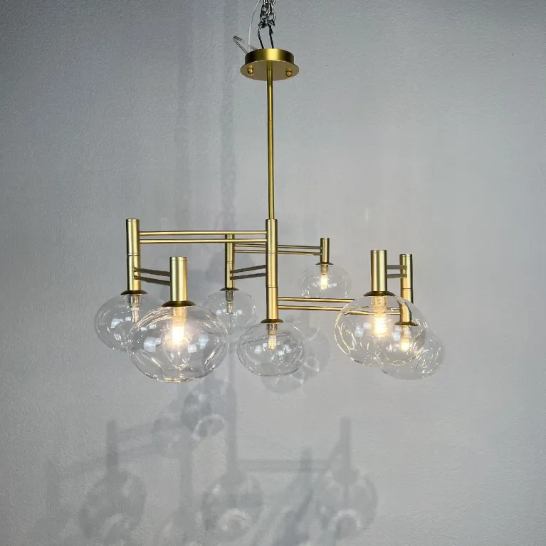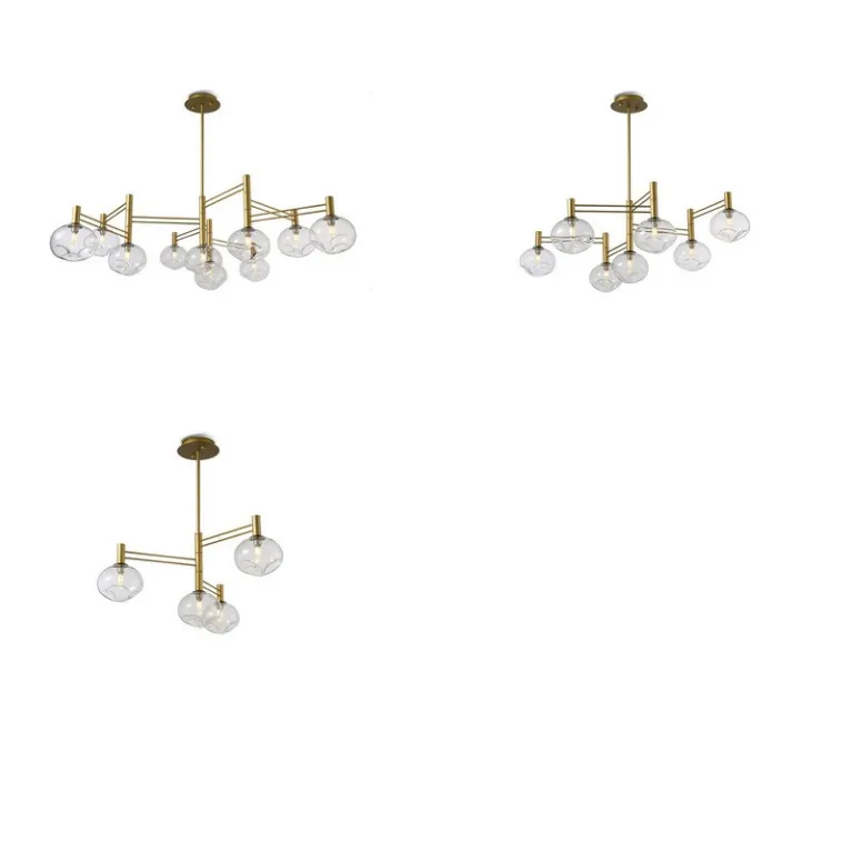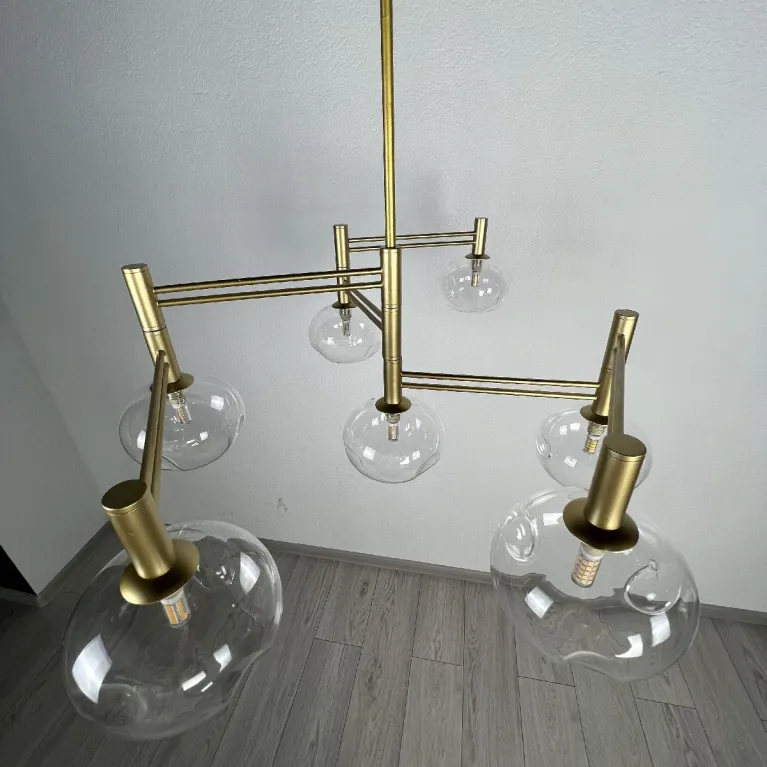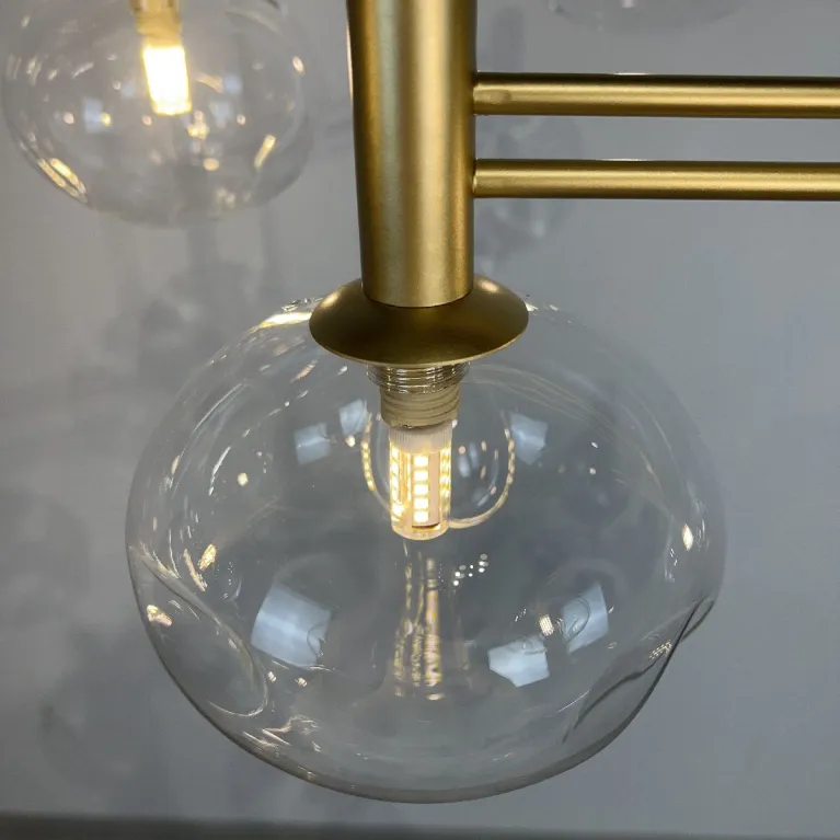 Преобладающий цвет плафонов: Прозрачный, арматуры: Золото; материал изготовления арматуры: Металл, размеры, мм: / высота 650 / диаметр 750. Общая мощность – 280 Ватт. Основной тип ламп, предусмотренный производителем: Галогеновая с цоколем G9. В зависимости от предпочтений можно использовать лампы теплового, холодного или нейтрального света, за исключением люстр с типом цоколя LED.