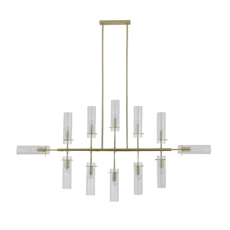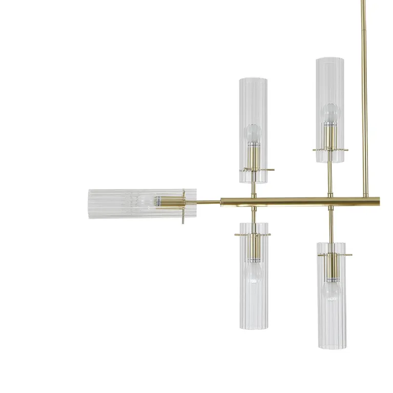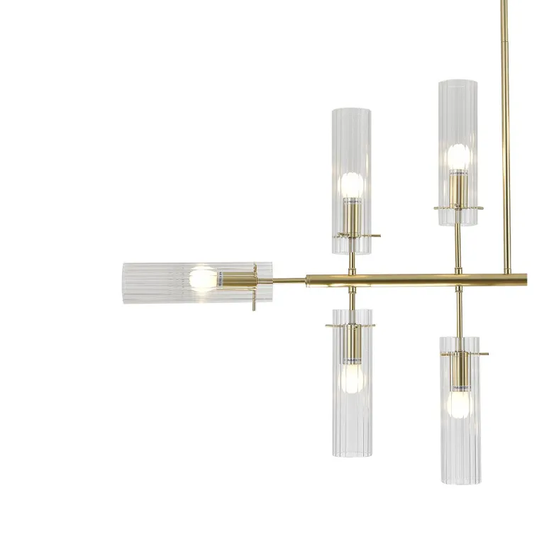 Преобладающий цвет плафонов: Прозрачный, арматуры: Золото; материал изготовления арматуры: Металл, размеры, мм: длина 1530 / ширина 97 / высота 1440 Общая мощность – 480 Ватт. Основной тип ламп, предусмотренный производителем: Накаливания с цоколем E14. В зависимости от предпочтений можно использовать лампы теплового, холодного или нейтрального света, за исключением люстр с типом цоколя LED.