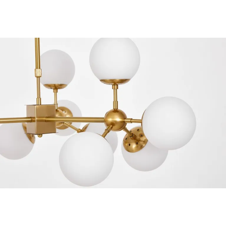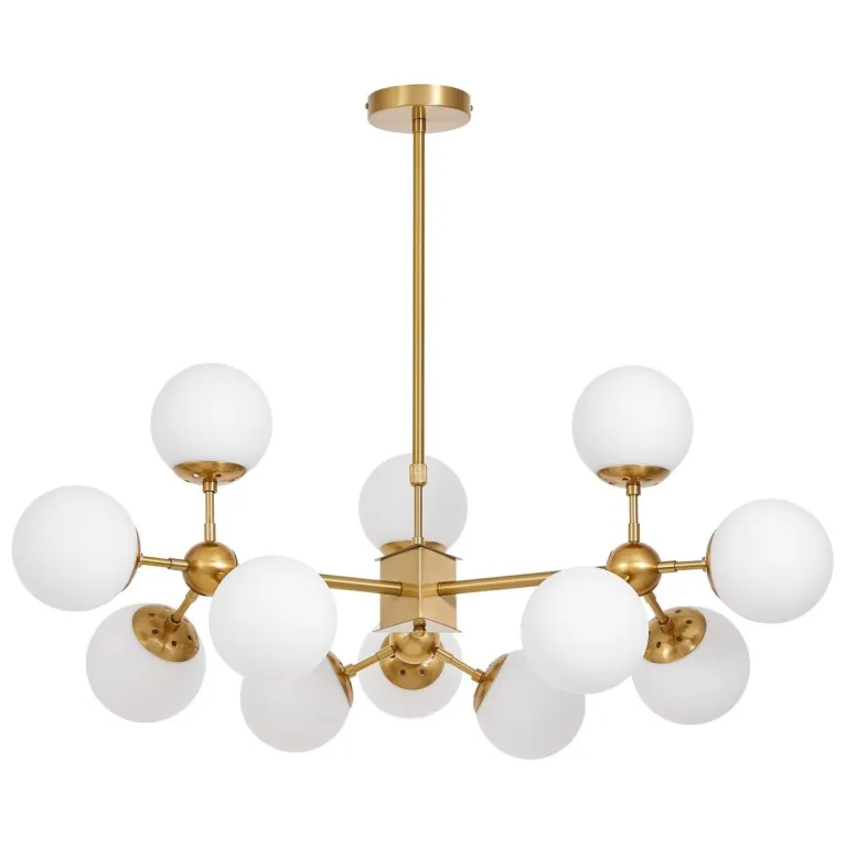 Преобладающий цвет плафонов: Белый, арматуры: Латунь; материал изготовления арматуры: Металл, размеры, мм: / высота 400 / диаметр 900. Общая мощность – 480 Ватт. Основной тип ламп, предусмотренный производителем: Накаливания с цоколем E27. В зависимости от предпочтений можно использовать лампы теплового, холодного или нейтрального света, за исключением люстр с типом цоколя LED.