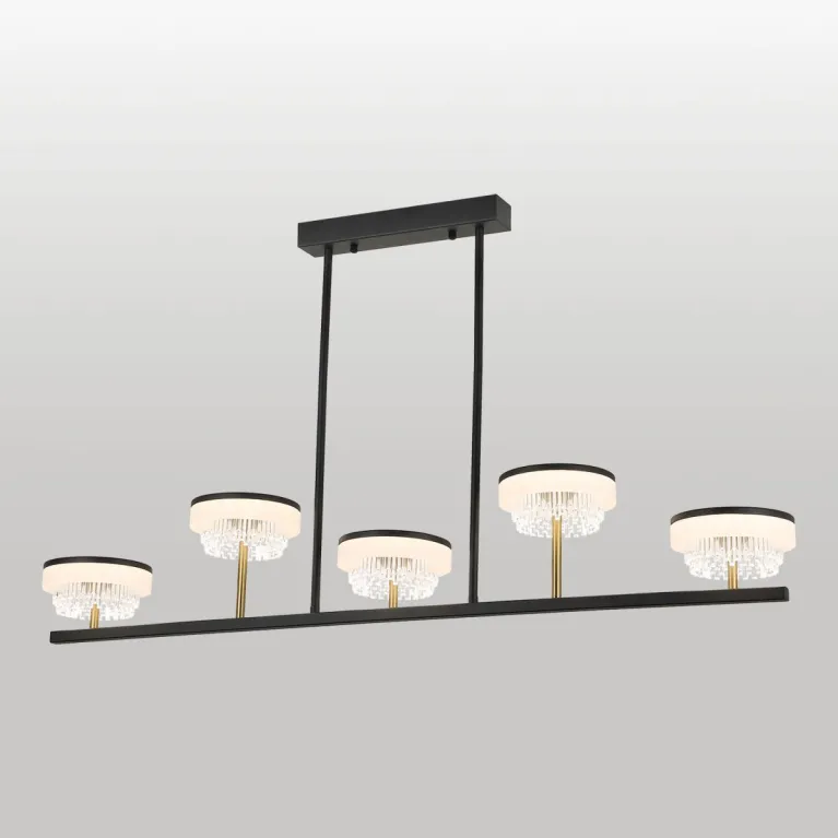 Преобладающий цвет плафонов: Белый, арматуры: Черный; материал изготовления арматуры: Металл, размеры, мм: / ширина 1050 / высота 560 / диаметр 150. Общая мощность – 35 Ватт. Основной тип ламп, предусмотренный производителем: Светодиодная с цоколем LED. В зависимости от предпочтений можно использовать лампы теплового, холодного или нейтрального света, за исключением люстр с типом цоколя LED.