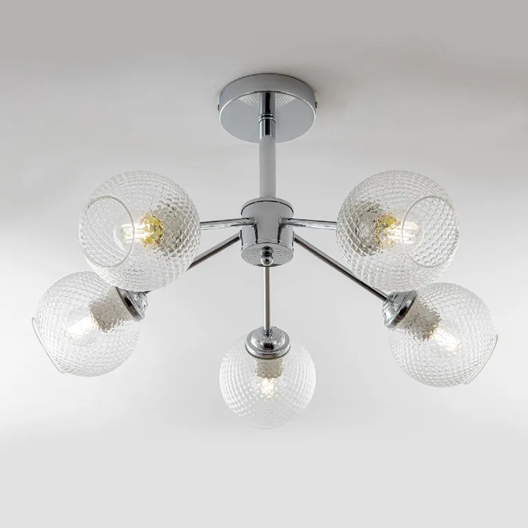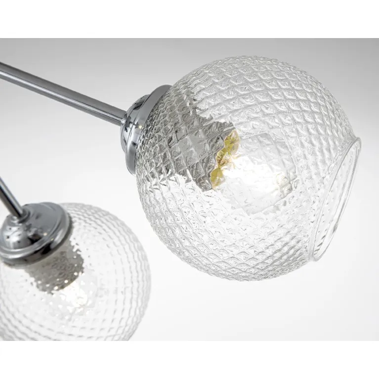 Преобладающий цвет плафонов: Прозрачный, арматуры: Хром; материал изготовления арматуры: Металл, размеры, мм: / высота 340 / диаметр 560. Общая мощность – 200 Ватт. Основной тип ламп, предусмотренный производителем: Накаливания с цоколем E27. В зависимости от предпочтений можно использовать лампы теплового, холодного или нейтрального света, за исключением люстр с типом цоколя LED.