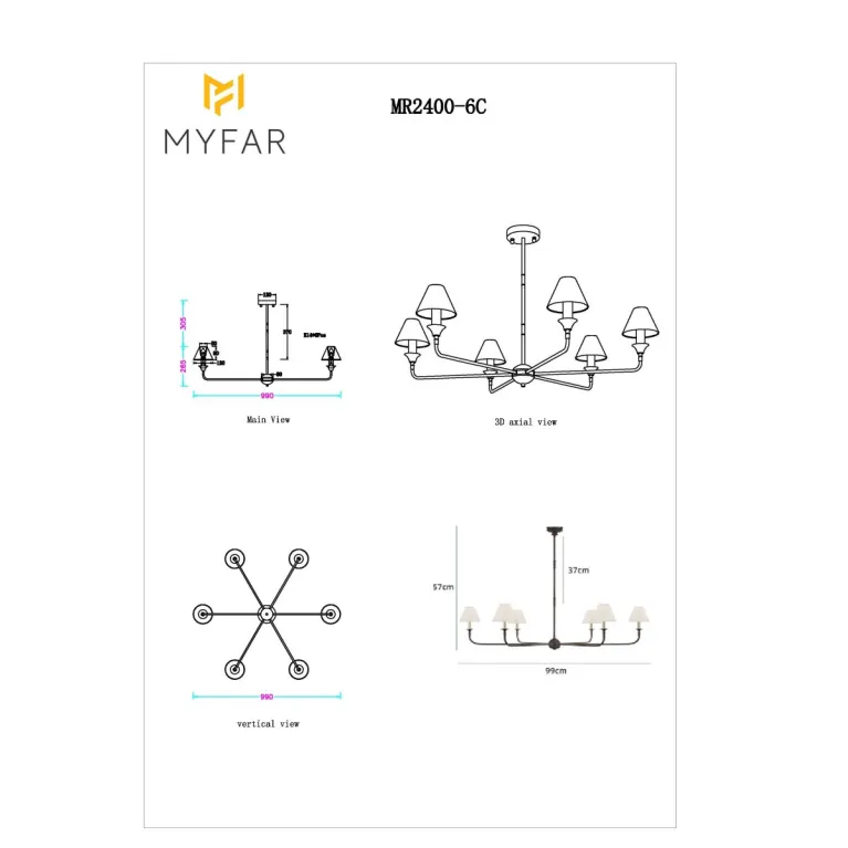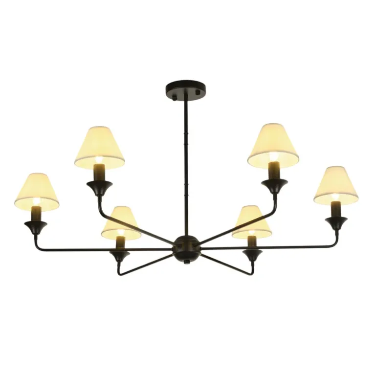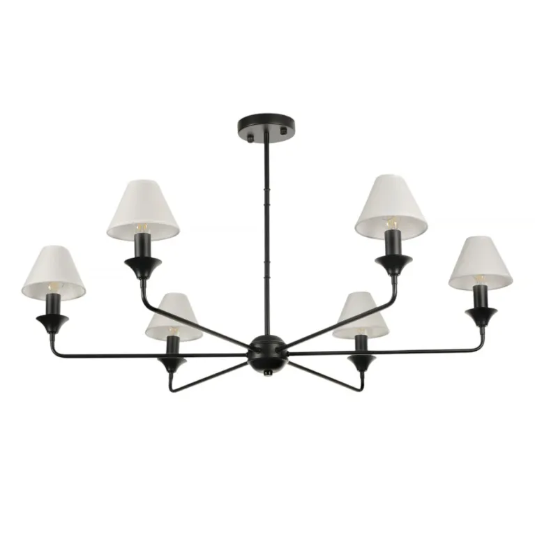 Преобладающий цвет плафонов: Белый, арматуры: Черный; материал изготовления арматуры: Металл, размеры, мм: / высота 570 / диаметр 990. Общая мощность – 360 Ватт, а максимальная площадь освещения до 14 м2. Основной тип ламп, предусмотренный производителем: Накаливания с цоколем E14. В зависимости от предпочтений можно использовать лампы теплового, холодного или нейтрального света, за исключением люстр с типом цоколя LED.