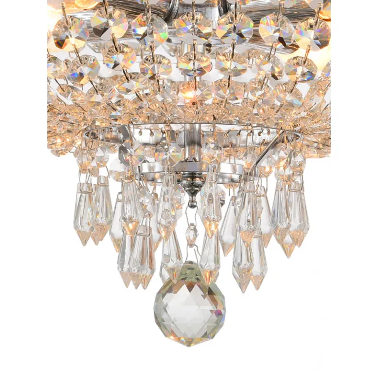 Преобладающий цвет плафонов: Прозрачный, арматуры: Хром; материал изготовления арматуры: Металл, размеры, мм: длина 400 / ширина 400 / высота 360 Общая мощность – 160 Ватт, а максимальная площадь освещения до 12 м2. Основной тип ламп, предусмотренный производителем: Накаливания с цоколем E14. В зависимости от предпочтений можно использовать лампы теплового, холодного или нейтрального света, за исключением люстр с типом цоколя LED.