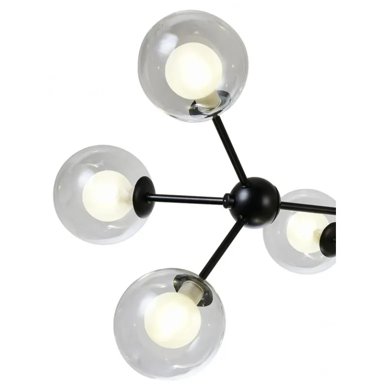 Преобладающий цвет плафонов: Белый, арматуры: Черный; материал изготовления арматуры: Металл, размеры, мм: длина 800 / ширина 800 / высота 900 Общая мощность – 252 Ватт, а максимальная площадь освещения до 18 м2. Основной тип ламп, предусмотренный производителем: Галогеновая с цоколем G9. В зависимости от предпочтений можно использовать лампы теплового, холодного или нейтрального света, за исключением люстр с типом цоколя LED.