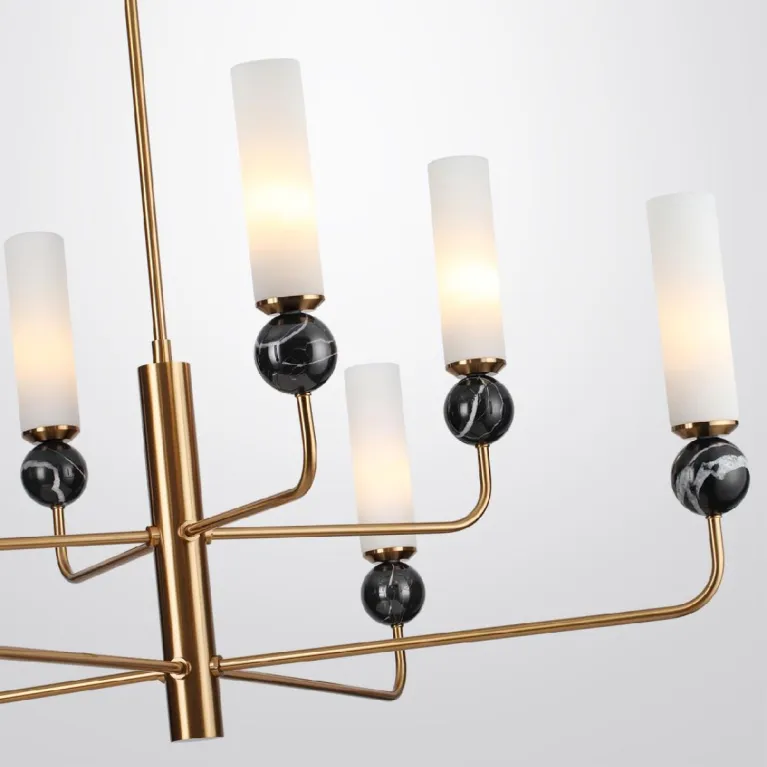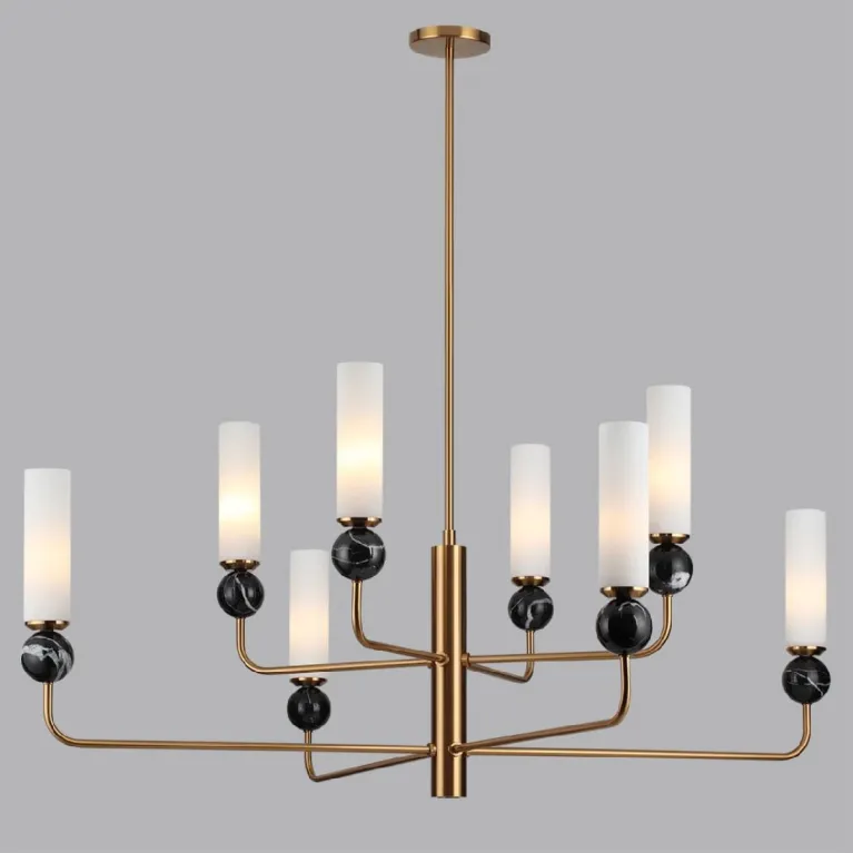 Преобладающий цвет плафонов: Белый, арматуры: Латунь; материал изготовления арматуры: Металл, размеры, мм: / высота 1440 / диаметр 1260. Общая мощность – 320 Ватт, а максимальная площадь освещения до 17 м2. Основной тип ламп, предусмотренный производителем: Накаливания с цоколем E14. В зависимости от предпочтений можно использовать лампы теплового, холодного или нейтрального света, за исключением люстр с типом цоколя LED.