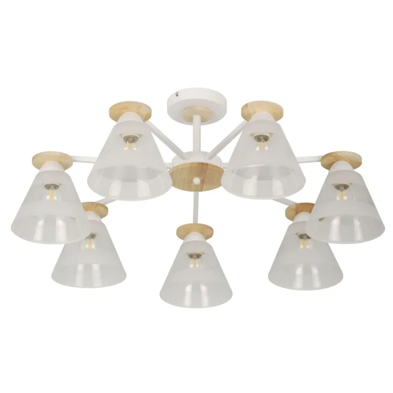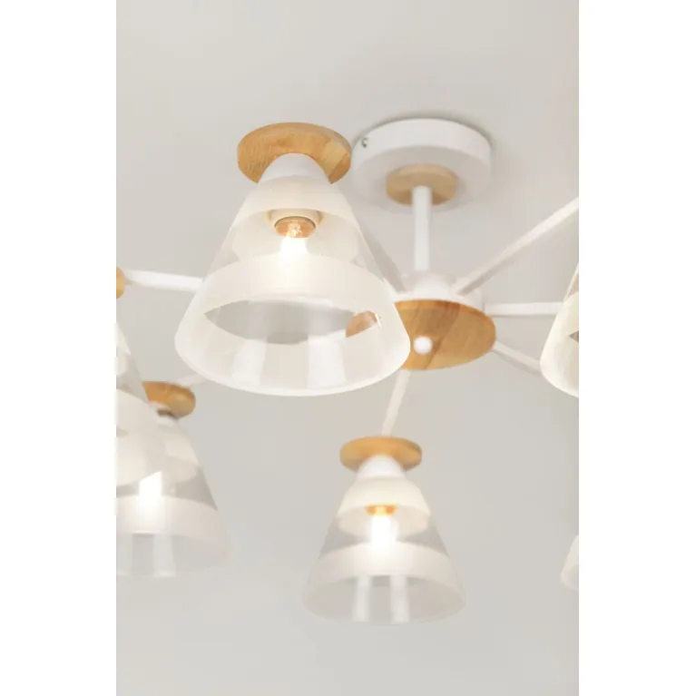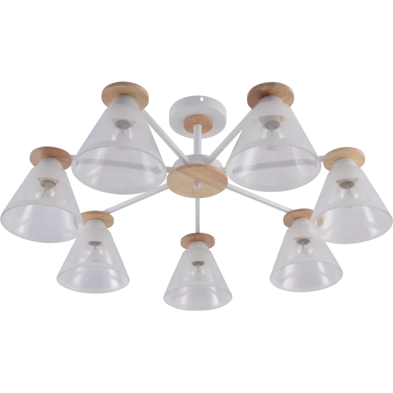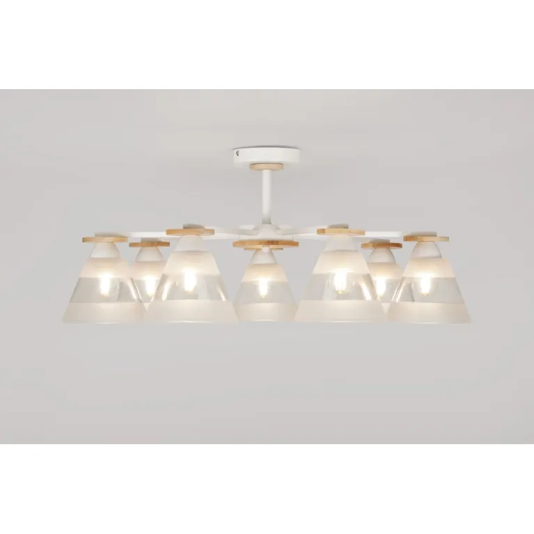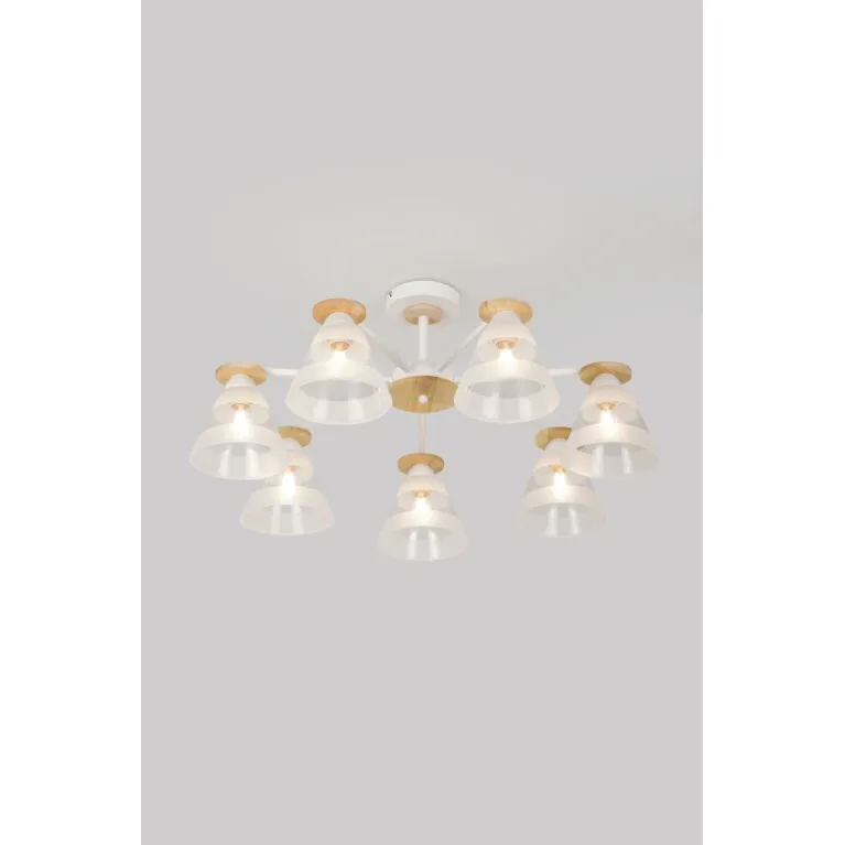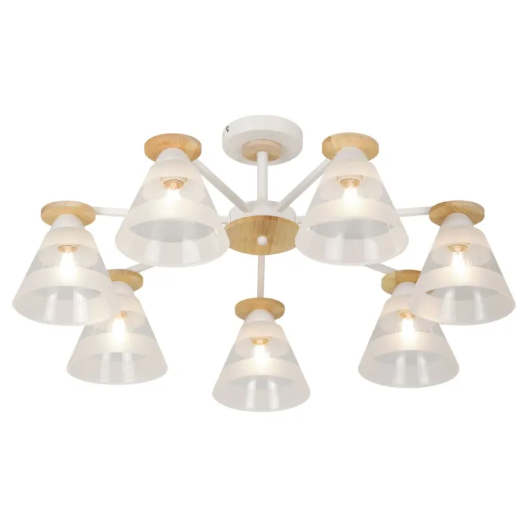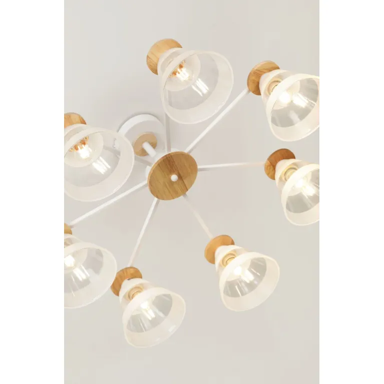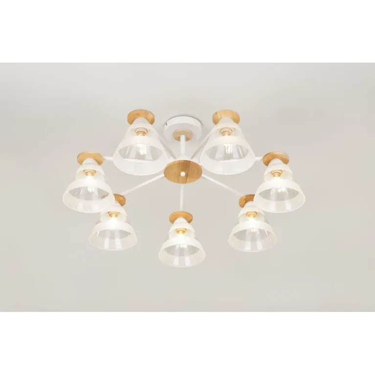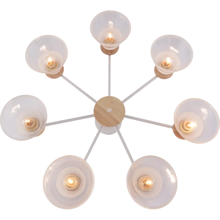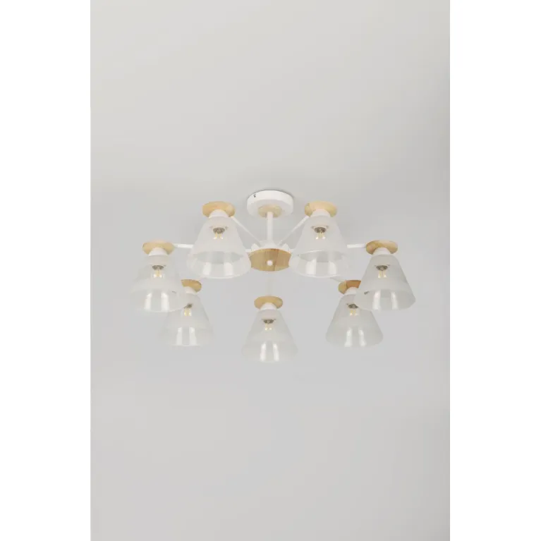 Преобладающий цвет плафонов: Прозрачный, арматуры: Белый; материал изготовления арматуры: Металл, размеры, мм: / высота 310 / диаметр 735. Общая мощность – 420 Ватт, а максимальная площадь освещения до 24 м2. Основной тип ламп, предусмотренный производителем: Накаливания с цоколем E27. В зависимости от предпочтений можно использовать лампы теплового, холодного или нейтрального света, за исключением люстр с типом цоколя LED.