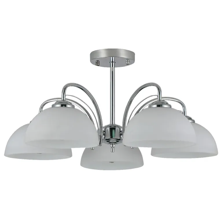 Преобладающий цвет плафонов: Белый, арматуры: Хром; материал изготовления арматуры: Металл, размеры, мм: / высота 240 / диаметр 580. Общая мощность – 200 Ватт, а максимальная площадь освещения до 10 м2. Основной тип ламп, предусмотренный производителем: Накаливания с цоколем E27. В зависимости от предпочтений можно использовать лампы теплового, холодного или нейтрального света, за исключением люстр с типом цоколя LED.