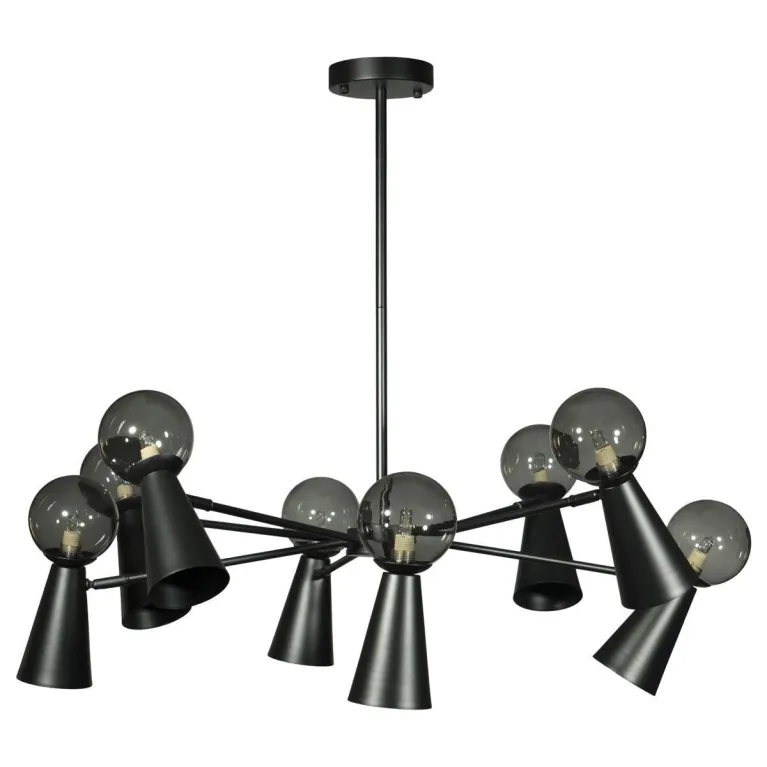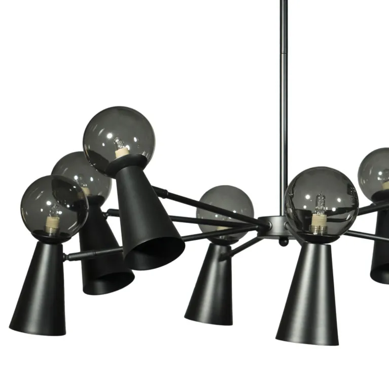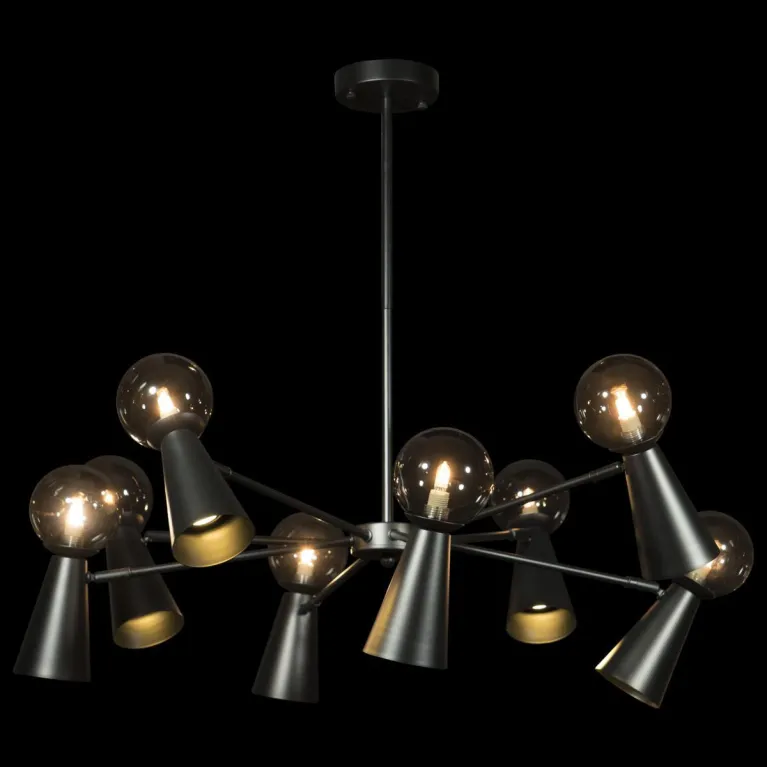 Люстра оснащена восемью лампами, что обеспечивает яркое и равномерное освещение. Она идеально подходит для просторных гостиной, столовой или спальни, создавая уютную и комфортную атмосферу. Основание выполнено из прочного металла черного цвета, что придает светильнику современный и стильный вид.