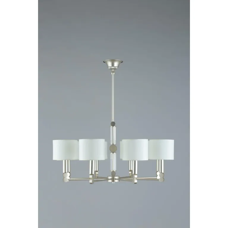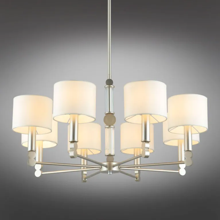Люстра оснащена восемью источниками света с цоколем E14, что позволяет использовать как традиционные лампы накаливания, так и энергосберегающие или светодиодные лампы, обеспечивая максимальную гибкость в выборе освещения. Суммарная мощность ламп составляет 320 Вт, что гарантирует яркое и равномерное освещение пространства.