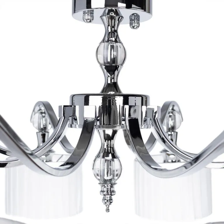 Корпус люстры выполнен из прочного металла и имеет эффектное хромированное покрытие, придающее изделию современный и стильный вид. Плафоны изготовлены из высококачественного матового стекла, которое мягко рассеивает свет и создает приятную атмосферу в помещении.