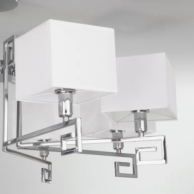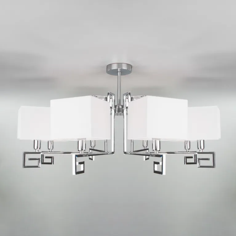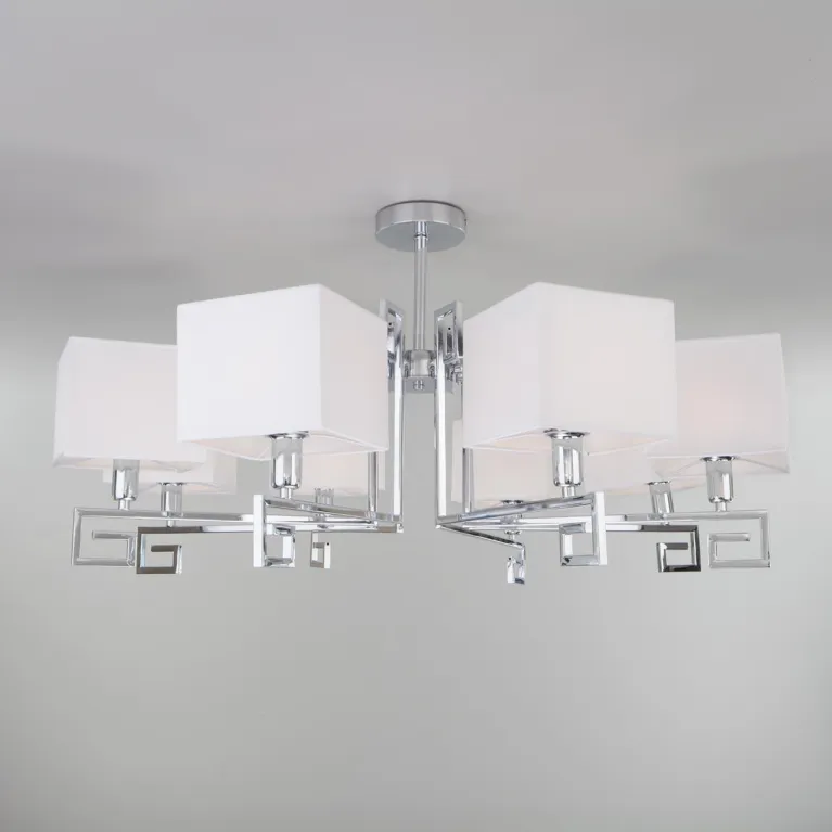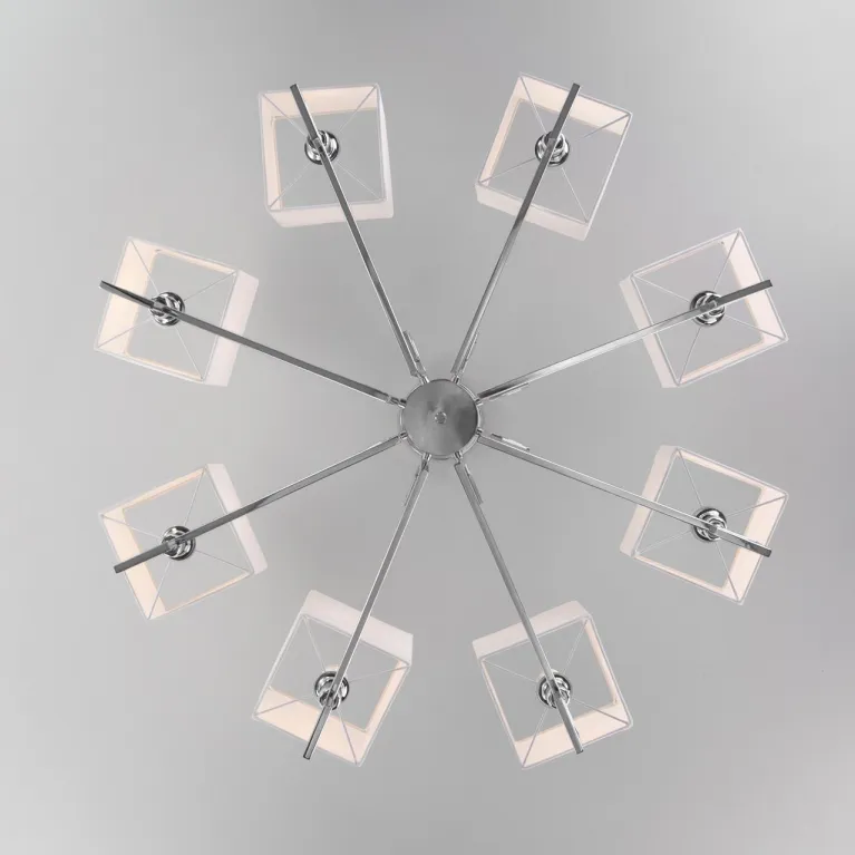 Люстра оснащена восемью лампами, которые обеспечивают яркое и равномерное освещение пространства. Она идеально подходит для помещений с высокими потолками благодаря своей высоте в 50 см. Корпус из прочного металла с хромированным покрытием придает светильнику современный и изящный вид.