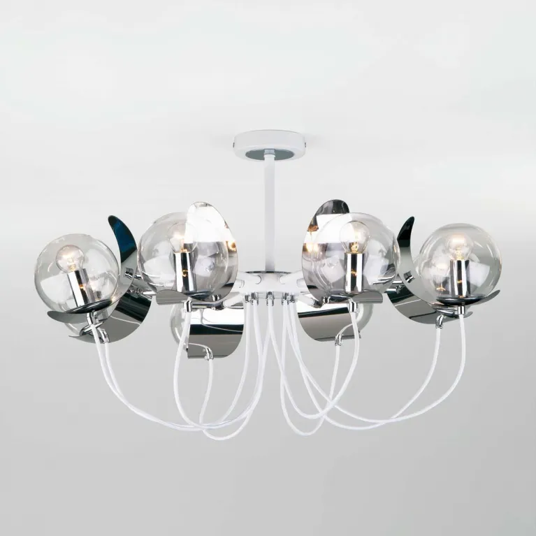 Люстра оснащена восемью лампами, что обеспечивает яркое и равномерное освещение пространства. Она идеально подходит для гостиной, столовой или спальни, добавляя уюта и гармонии вашему дому. Основание выполнено из прочного металла, что гарантирует долговечность и надежность конструкции.