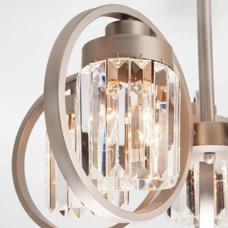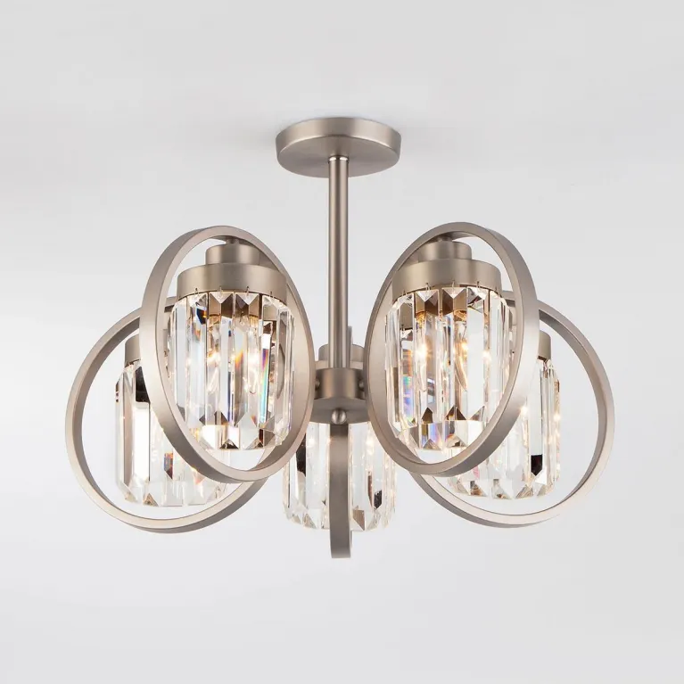 Люстра оснащена пятью лампами типа E14, что обеспечивает яркое и равномерное освещение. Основание выполнено из прочного металла с сатинированным никелевым покрытием, которое придает изделию современный и стильный вид. Прозрачные хрустальные подвески добавляют изысканности и утонченности, создавая эффектное мерцание света.