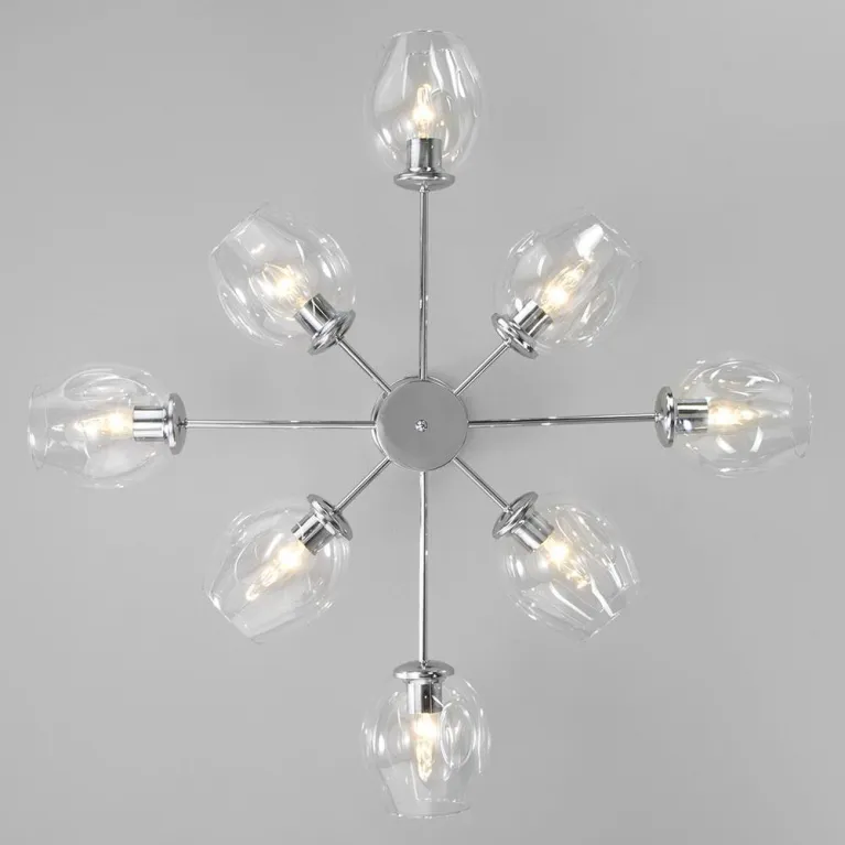 Люстра оснащена восемью лампами, что обеспечивает яркое и равномерное освещение пространства. Она выполнена в современном дизайне с хромированными элементами, которые придают ей стильный и современный вид.