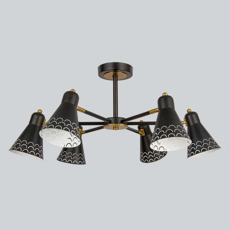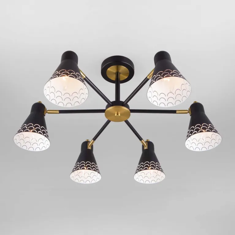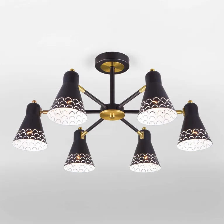 Люстра оснащена шестью лампами, что обеспечивает яркое и равномерное освещение пространства. Она изготовлена из прочного металла с черным матовым покрытием, которое придает ей современный и лаконичный вид.