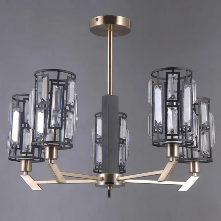 Подвесная конструкция люстры позволяет регулировать её высоту, что обеспечивает удобство при установке и адаптации к различным высотам потолков. Надежное крепление гарантирует стабильность и безопасность в эксплуатации.