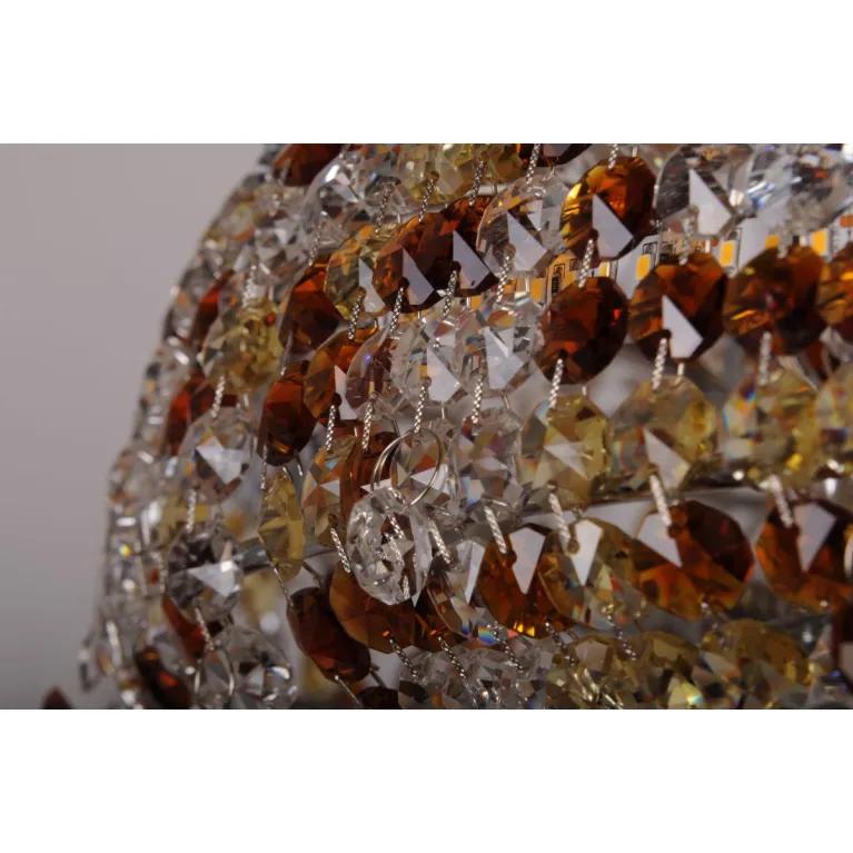 Преобладающий цвет плафонов: Разноцветный, арматуры: Хром; материал изготовления арматуры: Металл, размеры, мм: / высота 180 / диаметр 620. Общая мощность – 320 Ватт, а максимальная площадь освещения до 24 м2. Основной тип ламп, предусмотренный производителем: Накаливания с цоколем E14. В зависимости от предпочтений можно использовать лампы теплового, холодного или нейтрального света, за исключением люстр с типом цоколя LED.