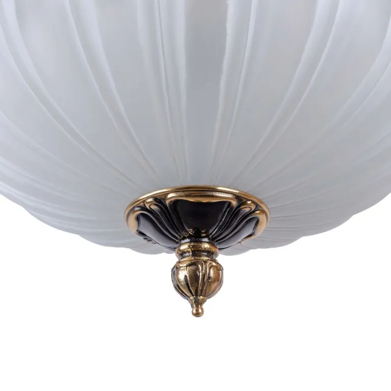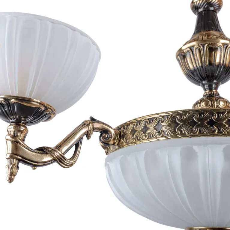 Преобладающий цвет плафонов: Белый, арматуры: Бронза; материал изготовления арматуры: Латунь, размеры, мм: / ширина 630 / высота 700 Общая мощность – 180 Ватт. Основной тип ламп, предусмотренный производителем: Светодиодная с цоколем E27. В зависимости от предпочтений можно использовать лампы теплового, холодного или нейтрального света, за исключением люстр с типом цоколя LED.