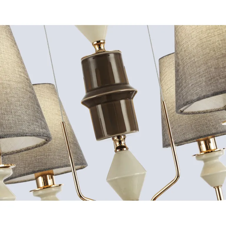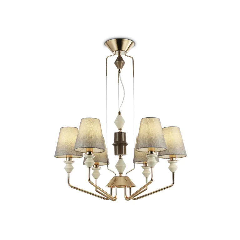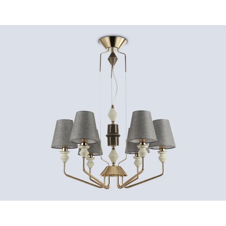 Преобладающий цвет плафонов: Серый, арматуры: Золото; материал изготовления арматуры: Металл, размеры, мм: / высота 1260 / диаметр 700. Общая мощность – 240 Ватт, а максимальная площадь освещения до 20 м2. Основной тип ламп, предусмотренный производителем: Накаливания с цоколем E14. В зависимости от предпочтений можно использовать лампы теплового, холодного или нейтрального света, за исключением люстр с типом цоколя LED.