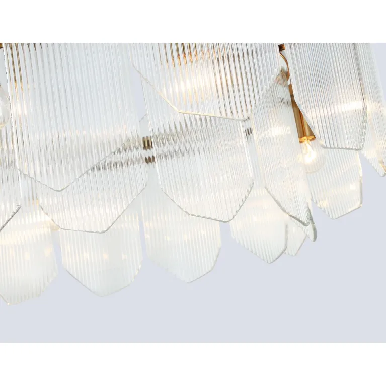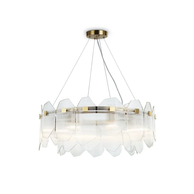 Преобладающий цвет плафонов: Прозрачный, арматуры: Латунь; материал изготовления арматуры: Металл, размеры, мм: / высота 1300 / диаметр 650. Общая мощность – 320 Ватт, а максимальная площадь освещения до 25 м2. Основной тип ламп, предусмотренный производителем: Накаливания с цоколем E14. В зависимости от предпочтений можно использовать лампы теплового, холодного или нейтрального света, за исключением люстр с типом цоколя LED.