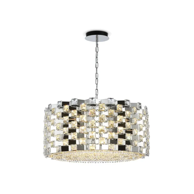 Преобладающий цвет плафонов: Прозрачный, арматуры: Хром; материал изготовления арматуры: Металл, размеры, мм: / высота 1200 / диаметр 700. Общая мощность – 720 Ватт, а максимальная площадь освещения до 49 м2. Основной тип ламп, предусмотренный производителем: Накаливания с цоколем E14. В зависимости от предпочтений можно использовать лампы теплового, холодного или нейтрального света, за исключением люстр с типом цоколя LED.