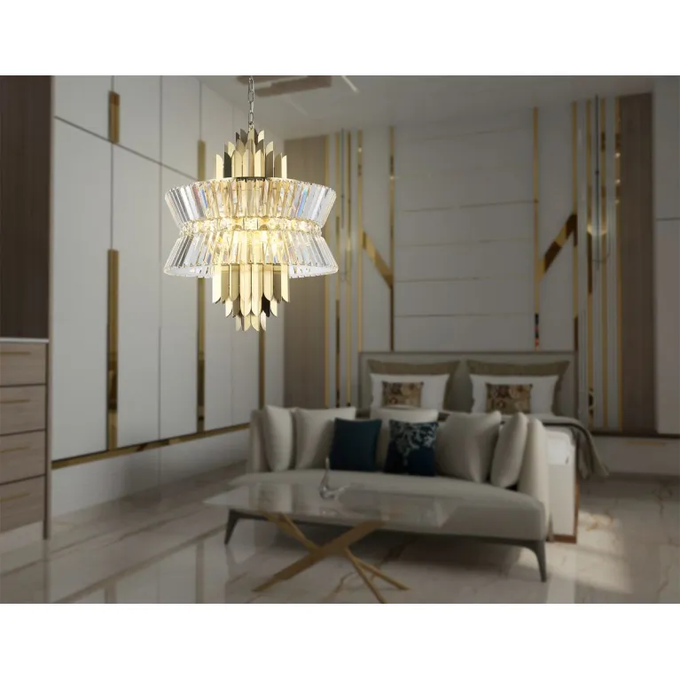 Преобладающий цвет плафонов: Прозрачный, арматуры: Латунь; материал изготовления арматуры: Металл, размеры, мм: / высота 1200 / диаметр 560. Общая мощность – 480 Ватт, а максимальная площадь освещения до 37 м2. Основной тип ламп, предусмотренный производителем: Накаливания с цоколем E14. В зависимости от предпочтений можно использовать лампы теплового, холодного или нейтрального света, за исключением люстр с типом цоколя LED.