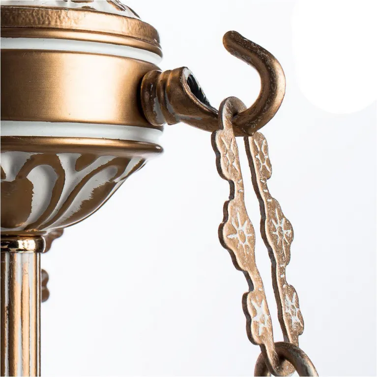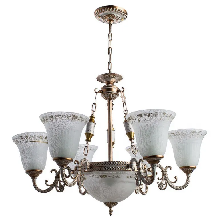 Люстра оснащена шестью лампами, что обеспечивает яркое и равномерное освещение пространства. Она идеально подходит для гостиной, столовой или спальни, добавляя уюта и стиля вашему дому. Основание выполнено из прочного металла, что гарантирует долговечность и надежность конструкции.