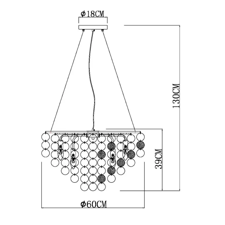 Преобладающий цвет плафонов: Белый, арматуры: Хром; материал изготовления арматуры: Металл, размеры, мм: / высота 390 / диаметр 600. Общая мощность – 320 Ватт, а максимальная площадь освещения до 10 м2. Основной тип ламп, предусмотренный производителем: Накаливания с цоколем E14. В зависимости от предпочтений можно использовать лампы теплового, холодного или нейтрального света, за исключением люстр с типом цоколя LED.