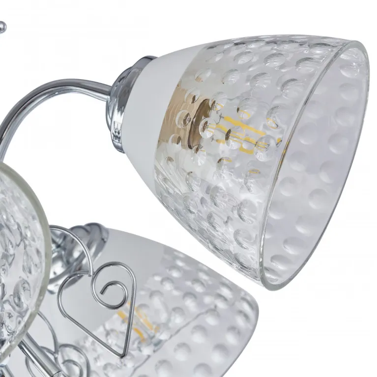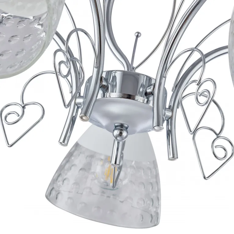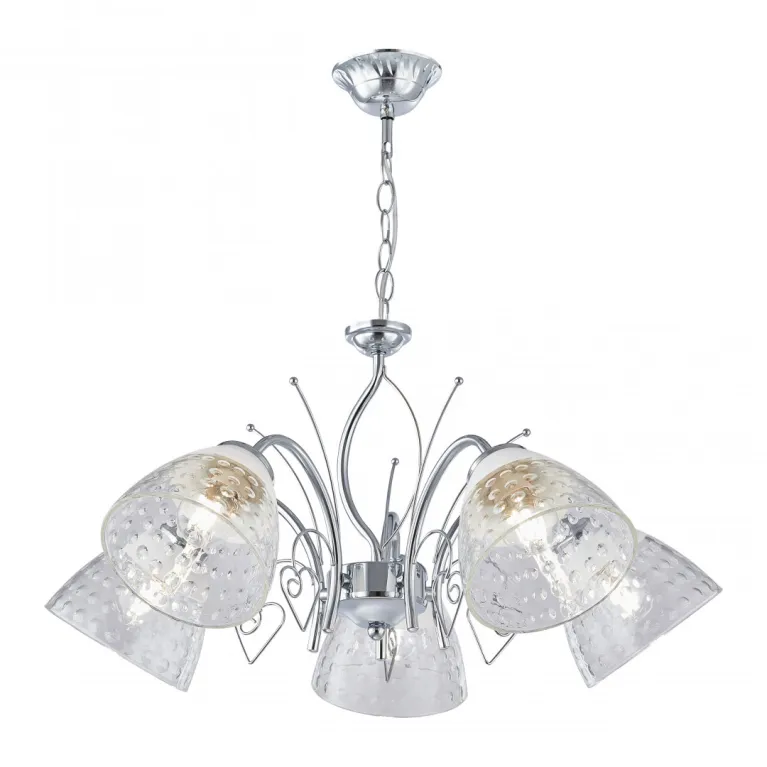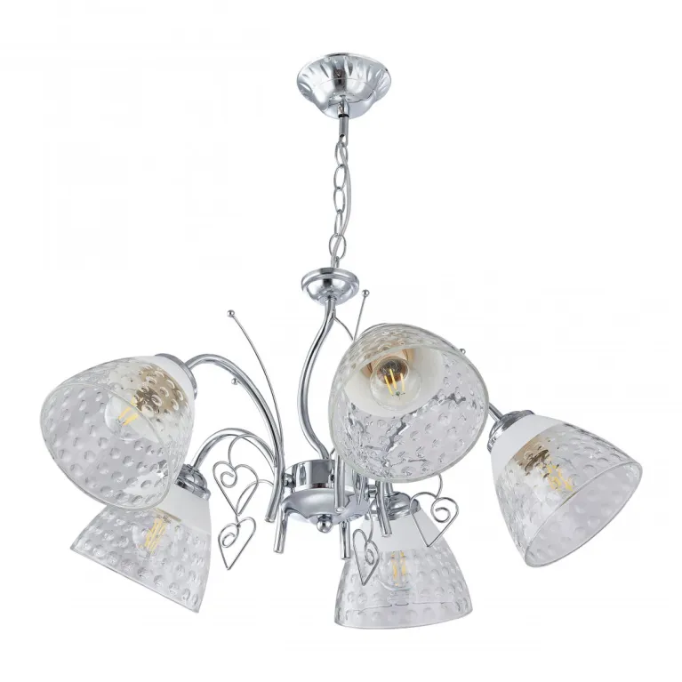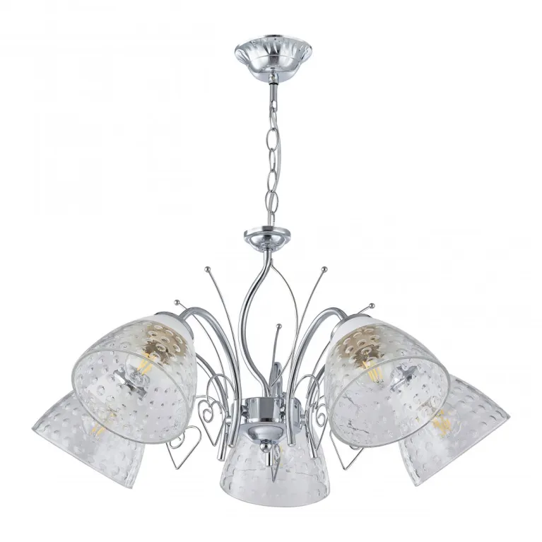 Преобладающий цвет плафонов: Прозрачный, арматуры: Хром; материал изготовления арматуры: Металл, размеры, мм: длина 290 / высота 290 / диаметр 580. Общая мощность – 200 Ватт. Основной тип ламп, предусмотренный производителем: Накаливания с цоколем E27. В зависимости от предпочтений можно использовать лампы теплового, холодного или нейтрального света, за исключением люстр с типом цоколя LED.