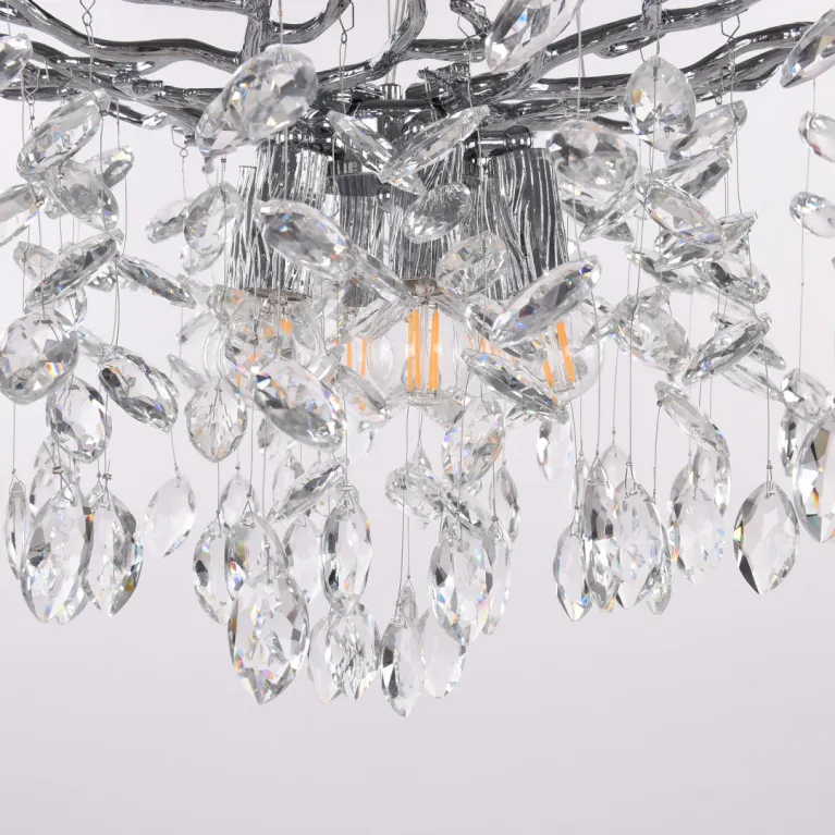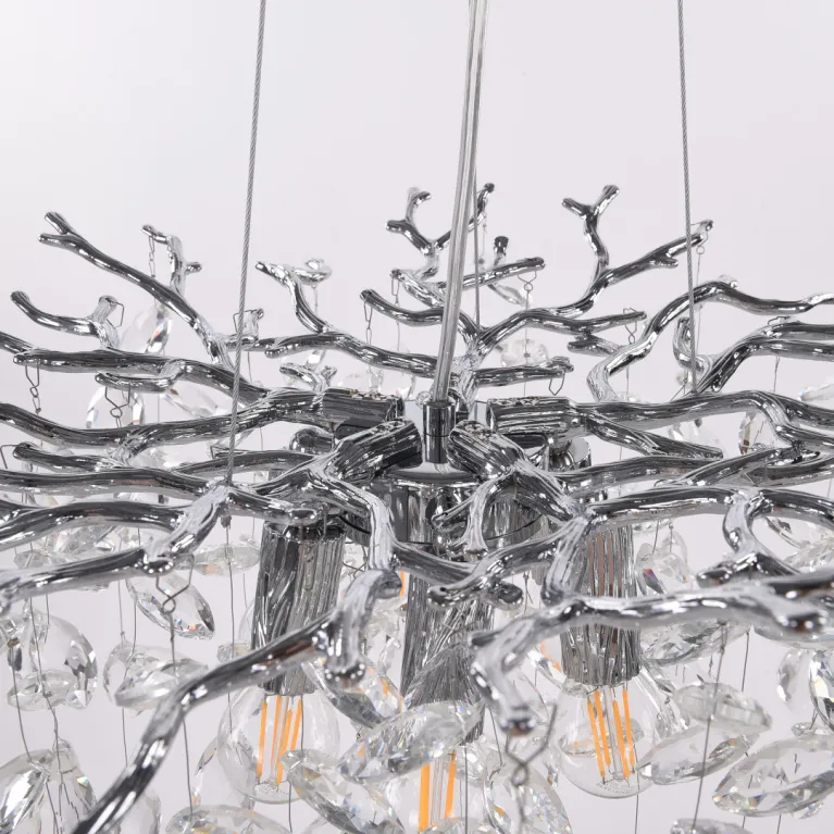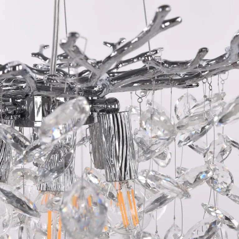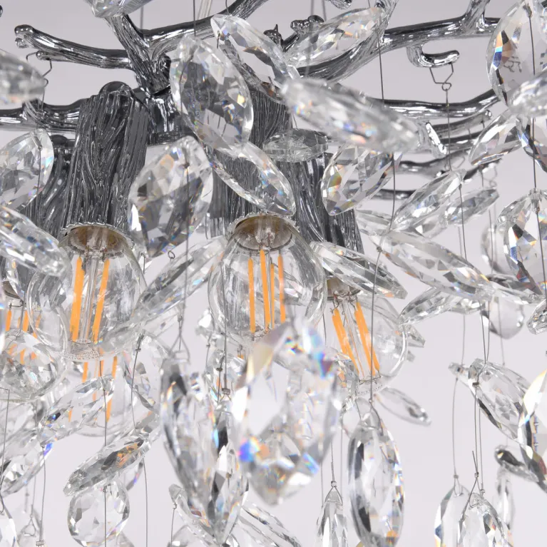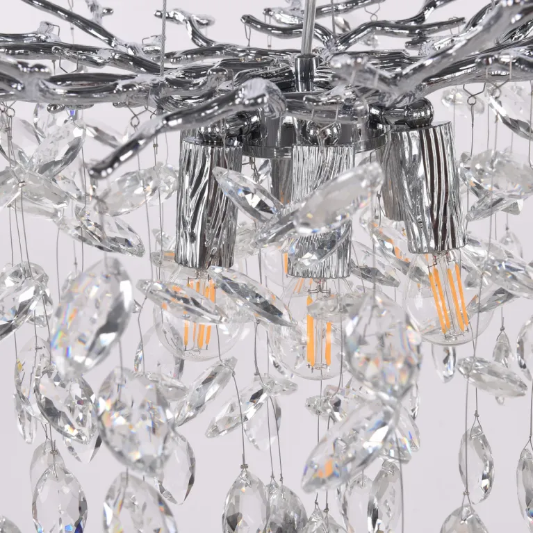 Преобладающий цвет плафонов: Прозрачный, арматуры: Хром; материал изготовления арматуры: Металл, размеры, мм: длина 300 / высота 300 / диаметр 480. Общая мощность – 240 Ватт. Основной тип ламп, предусмотренный производителем: Накаливания с цоколем E14. В зависимости от предпочтений можно использовать лампы теплового, холодного или нейтрального света, за исключением люстр с типом цоколя LED.