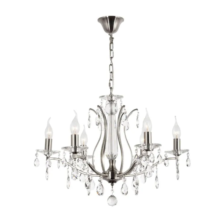Люстра оснащена пятью источниками света с цоколем E27, что позволяет использовать лампы различных типов и мощностей, обеспечивая яркое и равномерное освещение пространства. Основание изготовлено из прочного металла с никелевым покрытием, что придает изделию современный вид и долговечность.