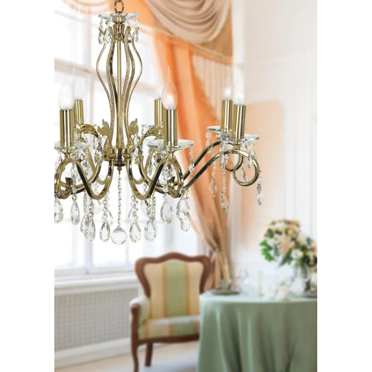 Люстра оснащена четырьмя лампами, что обеспечивает яркое и равномерное освещение пространства. Она идеально подходит для просторных гостиной, столовой или спальни, добавляя помещению утонченности и элегантности. Основание выполнено из прочного металла с гальваническим золотым покрытием, что придает изделию роскошный и современный вид.