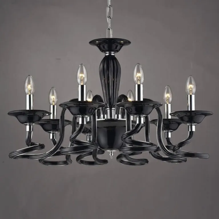 Люстра оснащена восемью лампами, что обеспечивает яркое и равномерное освещение. Она изготовлена из высококачественного металла и имеет стильное черное матовое покрытие, придающее ей современный и утонченный вид.