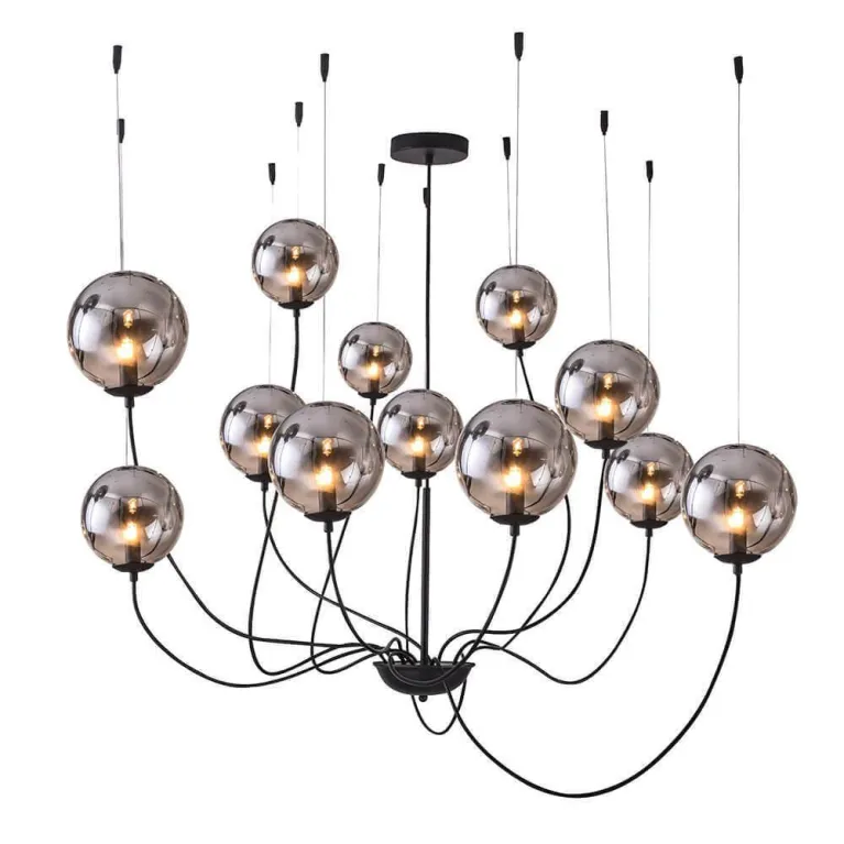 Люстра оснащена двенадцатью лампами, что обеспечивает яркое и равномерное освещение. Она изготовлена из высококачественного металла и имеет стильное матовое черное покрытие, придающее ей современный и утонченный вид.