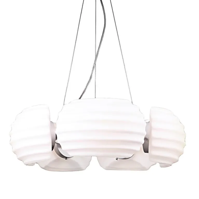 Элегантные плафоны из белого матового стекла придают люстре легкий и воздушный вид, делая её идеальным выбором для гостиной, столовой или спальни. Надежное крепление гарантирует стабильность и безопасность в эксплуатации.